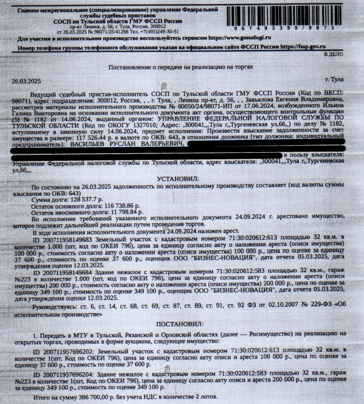 Здание, нежилое, нежилое здание, к.н. 71:30:020612:583, пл. 32 кв.м, местоположение: Тульская обл, г Тула, Привокзальный р-н, ул Филимоновская, 4, АК 25, гараж 223. Здание также расположено в пределах з.у. с к.н. 71:30:020612:564, имеющего особые отметки: Граница земельного участка не установлена в соответствии с требованиями земельного законодательства. См. Извещение о проведении торгов; Земельный участок, земли населенных пунктов, ВРИ нежилое здание: гараж с подвалом, к.н 71:30:020612:613, пл.: 32 +/- 2 кв.м. З.у. полностью расположен в границах зоны 71:30-6.599 от 02.12.2020, ограничение использования в пределах зоны. Вид ограничений (обременений): ограничения прав на земельный участок, предусмотренные ст. 56 ЗК РФ. Взыскатель: УФНС по Тульской области. Начальная цена: 386 700 (Триста восемьдесят шесть тысяч семьсот) руб. 00 коп., без НДС. Задаток: 190 000 (Сто девяносто тысяч) руб. 00 коп.; Шаг аукциона 1%: 3 867 (Три тысячи восемьсот шестьдесят семь) руб. 00 коп.