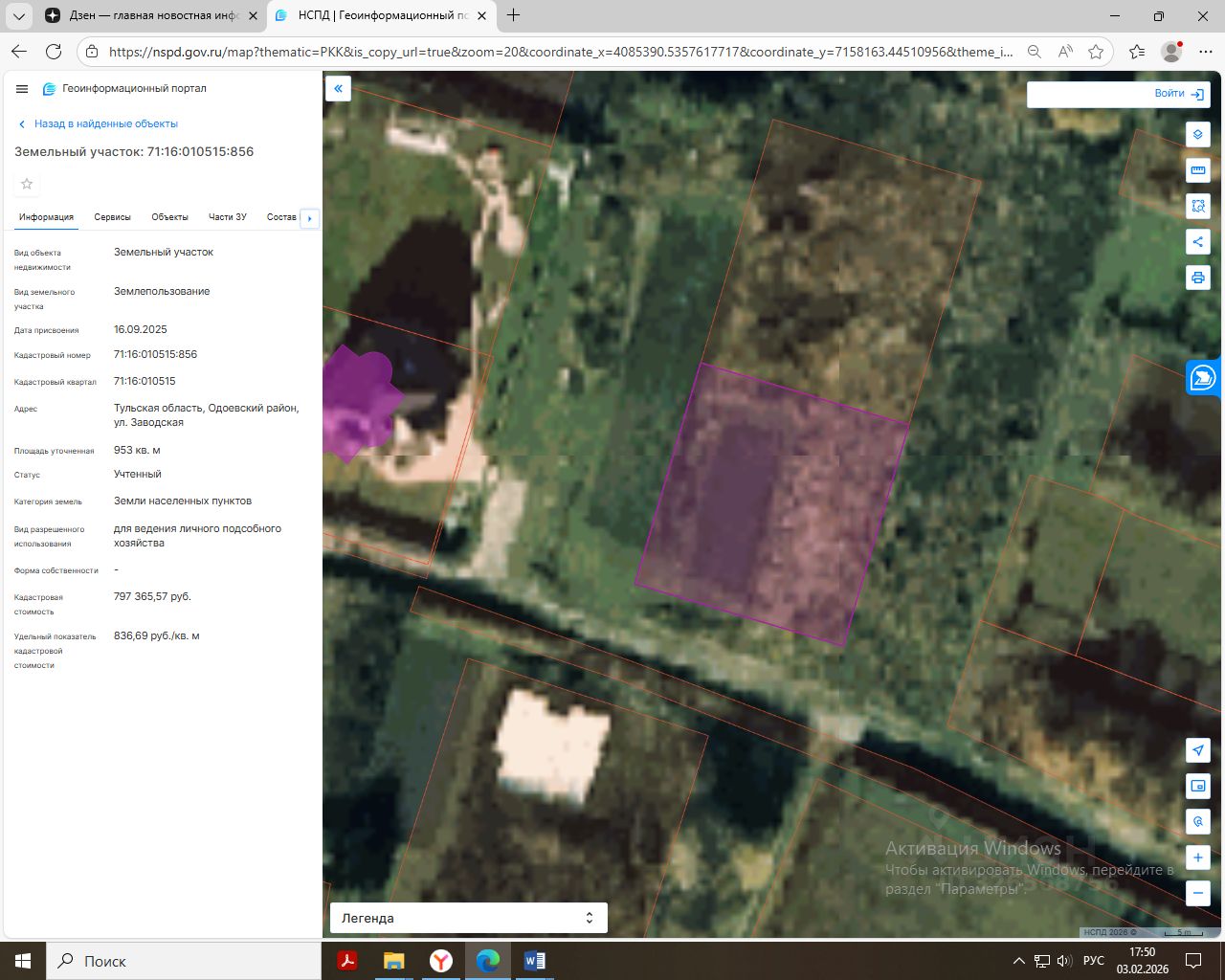 Земельный участок с кадастровым номером 71:16:010515:856, площадью 953 кв.м. по адресу: Тульская область, Одоевский район, ул. Заводская