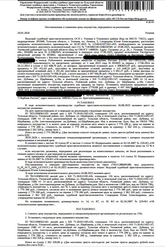 Здание, жилое, жилой дом, площадь 116 кв.м., кадастровый номер 71:20:011105:426, местоположение: Тульская область, Узловский район, п. Дубовка, ул.Щербакова, д.10а. Сведениями о зарегистрированных по данному адресу лицах Организатор торгов не располагает. Земельный участок, земли населенных пунктов, для строительства жилого дома, площадь 1589 +/- 14 кв.м., кадастровый номер 71:20:011105:147, местоположение: Тульская область, Узловский район, п. Дубовка, ул. Щербакова, д. 10-а. В пределах земельного участка также расположен объект недвижимости с кадастровым номером 71:20:011001:993, сведениями о правообладателе Организатор торгов не располагает. Ограничения прав на земельный участок, предусмотренные ст. 56 ЗК РФ. Залогодержатель: ПАО "Сбербанк России".Начальная цена: 2 362 320 (Два миллиона триста шестьдесят две тысячи триста двадцать) руб. 00 коп., без НДС. Задаток: 110 000 (Сто десять тысяч) руб. 00 коп. Шаг аукциона 1%: 23 623 (Двадцать три тысячи шестьсот двадцать три) руб. 20 коп.