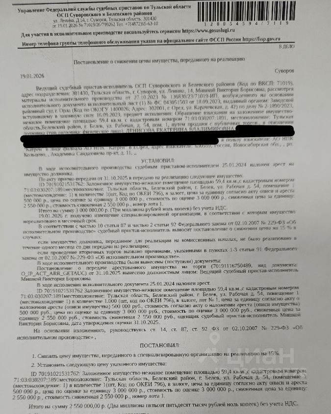 Помещение, назначение: нежилое, наименование: нежилое помещение, площадь 58,9 кв.м., кадастровый номер 71:03:030207:1891, адрес: Тульская область, Белевский район, город Белев, улица Рабочая, д.54, пом.1. Залогодержатель: АО "НПК "Катрен". Начальная цена: 2 550 000 (Два миллиона пятьсот пятьдесят тысяч) руб. 00 коп., без НДС. Задаток: 120 000 (Сто двадцать тысяч) руб. 00 коп. Шаг аукциона 1%: 25 500 (Двадцать пять тысяч пятьсот) руб. 00 коп.