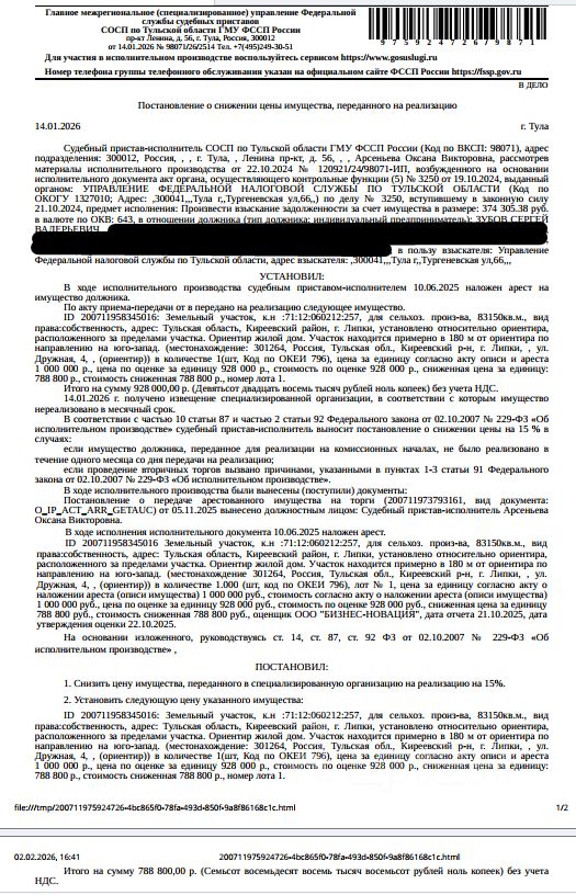 Земельный участок, категория земель: земли сельскохозяйственного назначения, виды разрешенного использования: для сельскохозяйственного производства, площадь 83150 +/- 2523 кв.м., кадастровый номер 71:12:060212:257, адрес: Тульская область, Киреевский район, г. Липки, установлено относительно ориентира, расположенного за пределами участка. Ориентир жилой дом. Участок находится примерно в 180м от ориентира по направлению на юго-запад. Почтовый адрес ориентира: обл. Тульская, р-н Киреевский, г. Липки, ул.Дружная, д.4. Взыскатель: УФНС по Тульской области. Начальная цена: 788 800 (Семьсот восемьдесят восемь тысяч восемьсот) руб. 00 коп., без НДС. Задаток: 390 000 (Триста девяносто тысяч) руб. 00 коп.; Шаг аукциона 1%: 7 888 (Семь тысяч восемьсот восемьдесят восемь) руб. 00 коп.