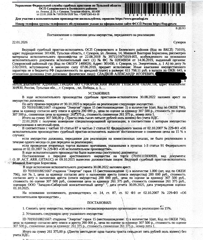 Здание, назначение: нежилое, наименование: гараж, площадь 28,8 кв.м., кадастровый номер 71:18:030213:2473, местоположение: Тульская область, Суворовский район, г. Суворов, район стадиона "Энергия"(Восточная сторона), гараж 15. Сведениями о земельном участке, на котором расположено здание, Организатор торгов не располагает. Взыскатель: Администрация МО Суворовский район Тульской обл. Начальная цена: 261 375 (Двести шестьдесят одна тысяча триста семьдесят пять) руб. 00 коп., без НДС. Задаток: 120 000 (Сто двадцать тысяч) руб. 00 коп.; Шаг аукциона 1%: 2 613 (Две тысячи шестьсот тринадцать) руб. 75 коп.