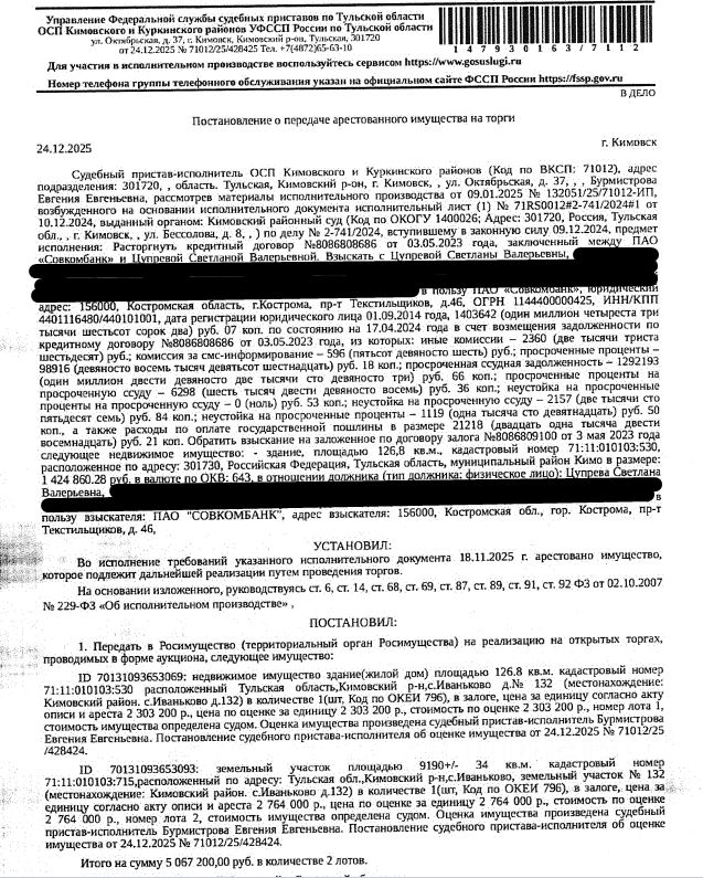 Здание, назначение: жилой дом, наименование: жилой дом, кадастровый номер: 71:11:010103:530, площадь 126,8 кв.м., местоположение: Тульская обл, м.р-н Кимовский, с/п Новольвовское, с. Иваньково, дом 132. Сведениями о зарегистрированных по данному адресу лицах Организатор торгов не располагает. Земельный участок, категория земель: земли населенных пунктов, виды разрешенного использования: для ведения личного подсобного хозяйства, кадастровый номер: 71:11:010103:715, площадь 9190 +/- 34 кв.м., адрес: Тульская обл, м.р-н Кимовский, с/п Новольвовское, с. Иваньково, з/у 132. Доп.информация - см.извещение. Залогодержатель: ПАО "Совкомбанк". Начальная цена: 5 067 200 (Пять миллионов шестьдесят семь тысяч двести) руб. 00 коп., без НДС. Задаток: 250 000 (Двести пятьдесят тысяч) руб. 00 коп. Шаг аукциона 1%: 50 672 (Пятьдесят тысяч шестьсот семьдесят два) руб. 00 коп.