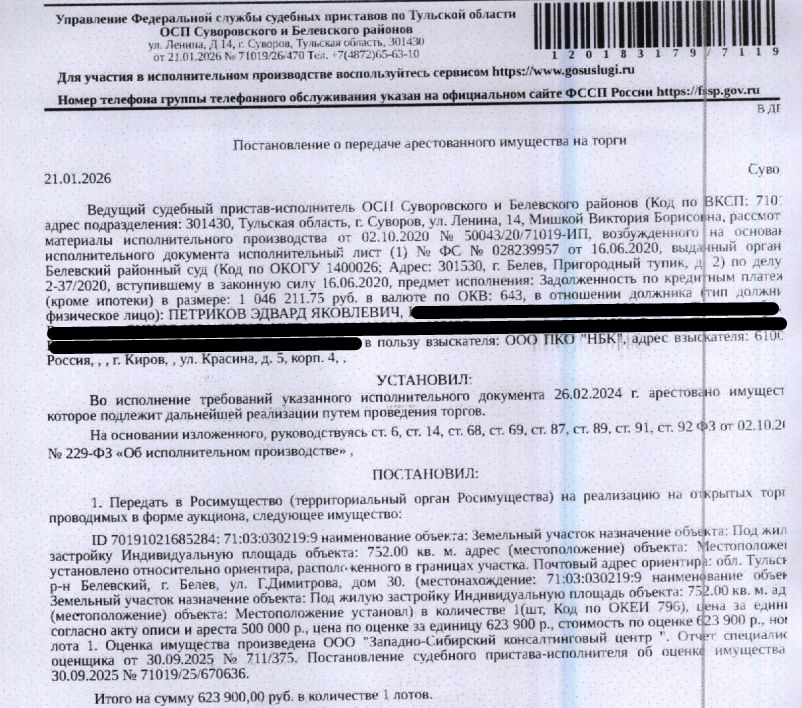 Земельный участок, категория земель: земли населенных пунктов, виды разрешенного использования: под жилую застройку индивидуальную, площадь 752 кв.м., кадастровый номер 71:03:030219:9, местоположение: обл. Тульская, р-н Белевский, г. Белев, ул. Г.Димитрова, дом 30. Земельный участок полностью расположен в границах зоны с реестровым номером 71:00-6.779 от 25.12.2018, ограничение использования земельного участка в пределах зоны: Вид ограничений (обременений): ограничения прав на земельный участок, предусмотренные ст. 56 ЗК РФ. Взыскатель: ООО ПКО "НБК". Начальная цена: 623 900 (Шестьсот двадцать три тысячи девятьсот) руб. 00 коп., без НДС. Задаток: 300 000 (Триста тысяч) руб. 00 коп.; Шаг аукциона 1%: 6 239 (Шесть тысяч двести тридцать девять) руб. 00 коп.