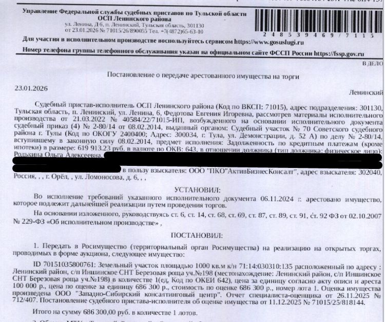 Земельный участок, категория земель: земли населенных пунктов, виды разрешенного использования: для коллективного садоводства, площадь 1000 +/- 22 кв.м., кадастровый номер 71:14:030310:135, местоположение: Тульская область, Ленинский район, сельское поселение Иншинское, СНТ "Березовая роща", участок 198. Вид ограничений (обременений): арест на основании постановления ОСП Ленинского района УФССП по Тульской области от 08.10.2020; постановления ОСП Ленинского района УФССП по Тульской области от 02.10.2019. Взыскатель: ООО "ПКО "АктивБизнесКонсалт". Начальная цена: 686 300 (Шестьсот восемьдесят шесть тысяч триста) руб. 00 коп., без НДС. Задаток: 340 000 (Триста сорок тысяч) руб. 00 коп.; Шаг аукциона 1%: 6 863 (Шесть тысяч восемьсот шестьдесят три) руб. 00 коп.