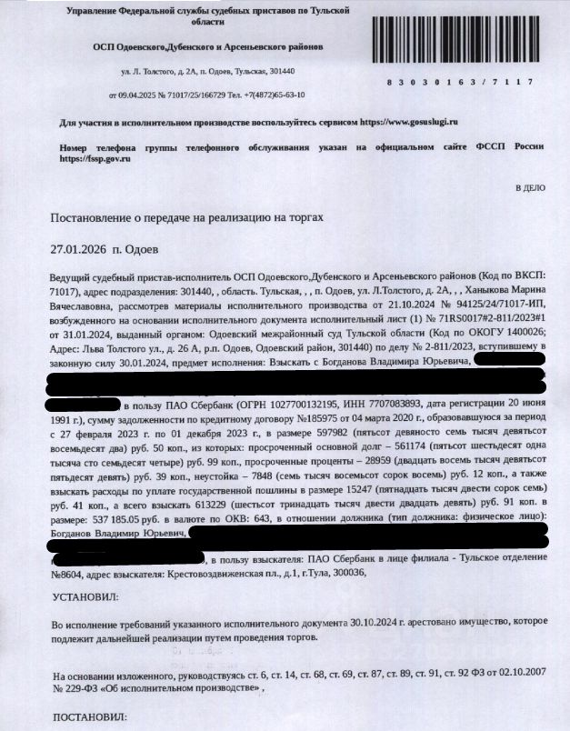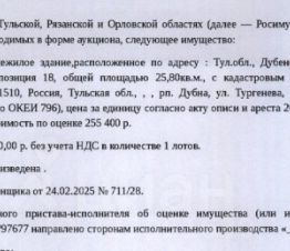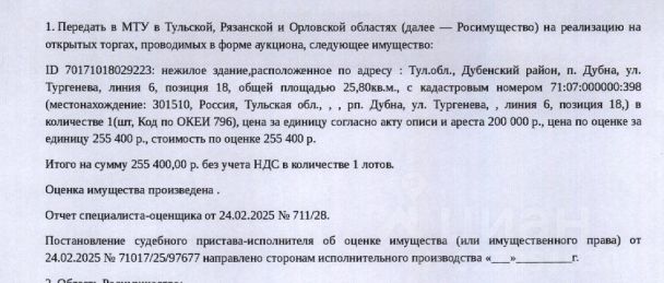 Здание, назначение: нежилое, наименование: нежилое здание (гараж), площадь 25,8 кв.м., кадастровый номер 71:07:000000:398, адрес: Тульская область, р-н Дубенский, п Дубна, ул Тургенева, линия 6,позиция 18. Сведениями о земельном участке, на котором расположено здание, Организатор торгов не располагает. Согласно ответу Администрации МО Дубенский район от 17.01.2025 земельный участок под зданием является государственной неразграниченной собственностью. Границы земельного участка не установлены в соответствии с требованиями земельного законодательства. СМ.ИЗВЕЩЕНИЕ. Взыскатель: ПАО "Сбербанк". Начальная цена: 255 400 (Двести пятьдесят пять тысяч четыреста) руб. 00 коп., без НДС. Задаток: 120 000 (Сто двадцать тысяч) руб. 00 коп.; Шаг аукциона 1%: 2 554 (Две тысячи пятьсот пятьдесят четыре) руб. 00 коп.