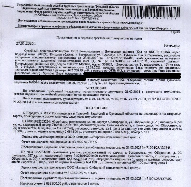 Здание, жилой дом, наименование: индивидуальный жилой дом, площадь 60,5 кв.м., кадастровый номер 71:25:010201:1680, адрес: Тульская обл, р-н. Богородицкий, г. Богородицк, ул. Оборонная, д. 20. Сведениями о зарегистрированных по данному адресу лицах Организатор торгов не располагает. Земельный участок,категория земель: земли населенных пунктов, ВРИ: для индивидуального жилищного строительства, площадь 617 +/- 5.56 кв.м., кадастровый номер 71:25:010201:420, местоположение установлено относительно ориентира,расположенного в границах участка.Почтовый адрес ориентира: обл. Тульская, р-н Богородицкий, г. Богородицк, ул. Оборонная, дом 20. Ограничения прав на земельный участок, предусмотренные ст. 56 ЗК РФ. Взыскатель: ПАО "Сбербанк России". Начальная цена: 2 688 600 (Два миллиона шестьсот восемьдесят восемь тысяч шестьсот) руб. 00 коп., без НДС. Задаток: 1 300 000 (Один миллион триста тысяч) руб. 00 коп.;Шаг аукциона 1%: 26 886 (Двадцать шесть тысяч восемьсот восемьдесят шесть) руб. 00 коп.