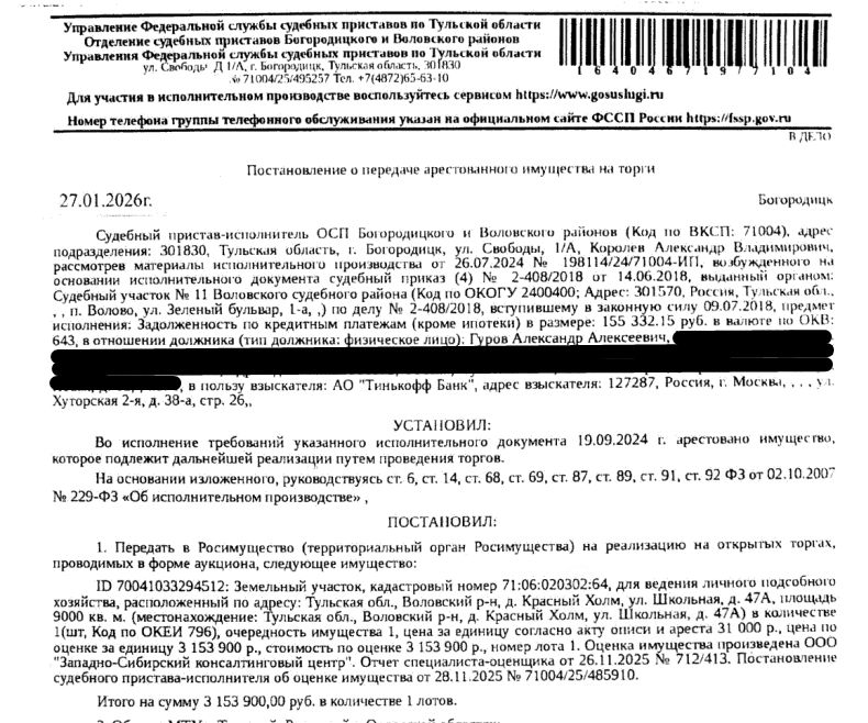Земельный участок, категория земель: земли населенных пунктов, виды разрешенного использования: для ведения личного подсобного хозяйства, площадь 9000 кв.м., кадастровый номер 71:06:020302:64, местоположение установлено относительно ориентира, расположенного за пределами участка.Ориентир жилой дом.Участок находится примерно в 260 м, по направлению на восток от ориентира. Почтовый адрес ориентира: обл. Тульская, р-н Воловский, д. Красный Холм, ул. Школьная, дом 47а. Особые отметки: Граница земельного участка не установлена в соответствии с требованиями земельного законодательства. СМ.ИЗВЕЩЕНИЕ. Взыскатель: АО "Тинькофф банк". Начальная цена: 3 153 900 (Три миллиона сто пятьдесят три тысячи девятьсот) руб. 00 коп., без НДС. Задаток: 1 500 000 (Один миллион пятьсот тысяч) руб. 00 коп.; Шаг аукциона 1%: 31 539 (Тридцать одна тысяча пятьсот тридцать девять) руб. 00 коп.