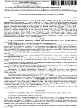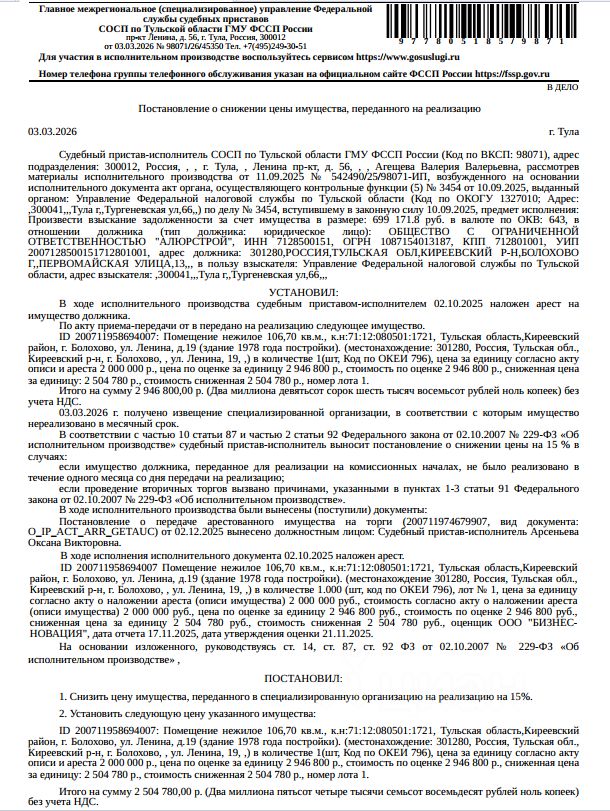 Помещение, назначение: нежилое, наименование: нежилое помещение, площадь 106,7кв.м., кадастровый номер 71:12:080501:1721, адрес: Тульская область, р-н. Киреевский, г. Болохово, ул. Ленина, д. 19, пом. Нежилое помещение. Взыскатель: УФНС по Тульской области. Начальная цена: 2 504 780 (Два миллиона пятьсот четыре тысячи семьсот восемьдесят) руб. 00 коп., без НДС. Задаток: 1 200 000 (Один миллион двести тысяч) руб. 00 коп.; Шаг аукциона 1%: 25 047 (Двадцать пять тысяч сорок семь) руб. 80 коп.