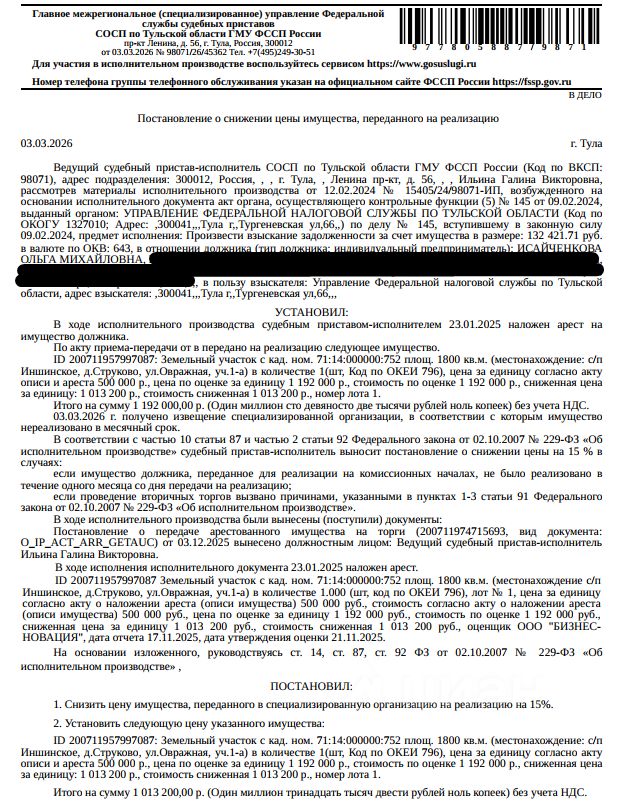 Земельный участок, категория земель: земли населенных пунктов, виды разрешенного использования: для индивидуального жилищного строительства, площадь 1800 +/- 17.1 кв.м., кадастровый номер 71:14:000000:752, местоположение установлено относительно ориентира, расположенного в границах участка. Почтовый адрес ориентира: обл. Тульская, р-н Ленинский, с/п Иншинское, д. Струково, ул. Овражная, участок 1-а. Вид ограничений (обременений): ограничения прав на земельный участок, предусмотренные ст. 56 ЗК РФ. Взыскатель: УФНС по Тульской области. Начальная цена: 1 013 200 (Один миллион тринадцать тысяч двести) руб. 00 коп., без НДС. Задаток: 500 000 (Пятьсот тысяч) руб. 00 коп.; Шаг аукциона 1%: 10 132 (Десять тысяч сто тридцать два) руб. 00 коп.