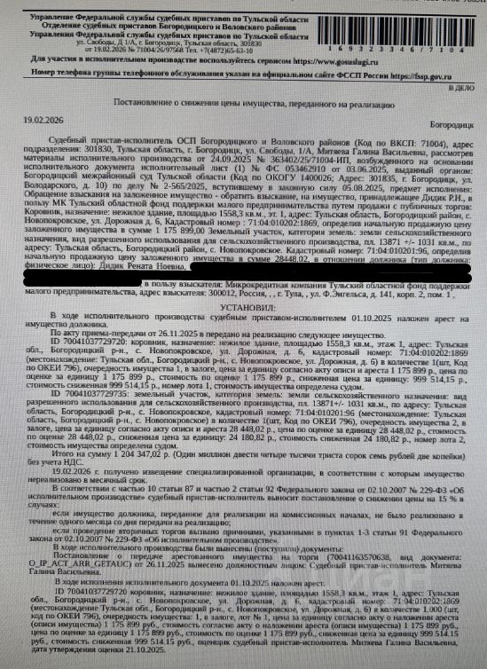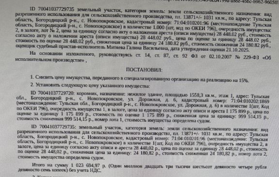 Здание, нежилое, наименование: коровник, кадастровый номер: 71:04:010202:1869, площадь 1558,3 кв.м., местоположение: Тульская обл, Богородицкий р-н, с.Новопокровское, ул.Дорожная, д.6. Земельный участок, категория земель: земли сельскохозяйственного назначения, ВРИ: для сельскохозяйственного производства, кадастровый номер: 71:04:010201:96, площадь 13871 +/- 1031 кв. м., местоположение: Тульская обл, Богородицкий р-н, с. Новопокровское. Особые отметки: для данного земельного участка обеспечен доступ посредством земельных участков с кадастровыми номерами: земли (земельные участки) общего пользов. Ограничения прав на з/у, предусмотренные ст. 56 ЗК РФ. Залогодержатель: Микрокредитная компания Тульский областной фонд поддержки малого предпринимательства. Начальная цена: 1 023 694 (Один миллион двадцать три тысячи шестьсот девяносто четыре) руб. 97 коп., без НДС. Задаток: 40 000 (Сорок тысяч) руб. 00 коп. Шаг аукциона 1%: 10 236 (Десять тысяч двести тридцать шесть) руб. 95 коп.