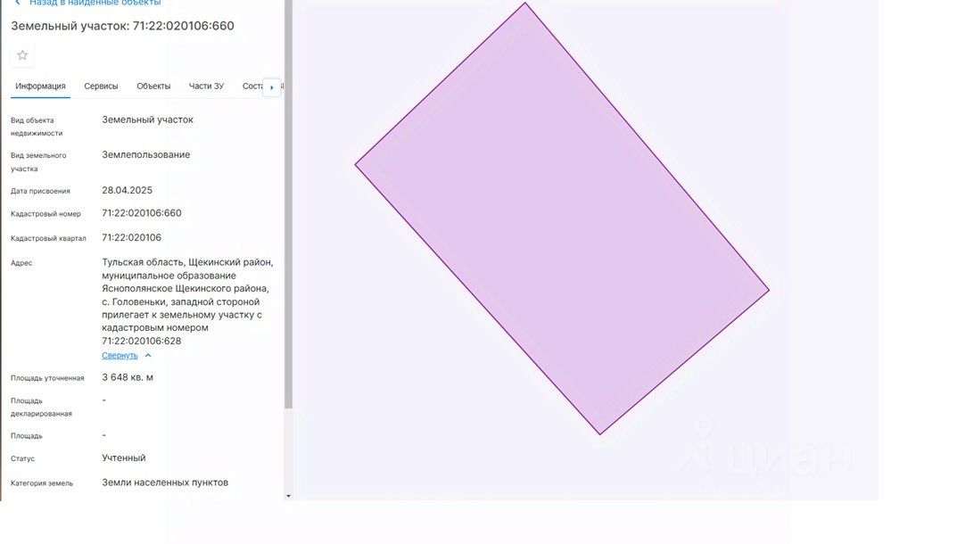 площадью 3648 кв.м, с кадастровым номером 71:22:020106:660, расположенного по адресу: Тульская область, Щекинский район, муниципальное образование Яснополянское Щекинского района, с. Головеньки, западной стороной прилегает к земельному участку с кадастровым номером 71:22:020106:628, разрешенное использование для ведения личного подсобного хозяйства