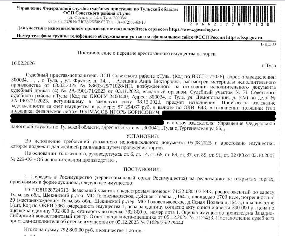 Земельный участок, категория земель: земли населенных пунктов, виды разрешенного использования: для личного подсобного хозяйства, площадь 1700 +/- 29 кв.м., кадастровый номер 71:22:030103:593, местоположение установлено относительно ориентира, расположенного за пределами участка.Ориентир - жилой дом.Участок находится примерно в 1200 м, по направлению на северо-запад от ориентира. Почтовый адрес ориентира: Тульская обл, р-н Щекинский, тер МО Головеньковское, д Ясная Поляна, д 164-а. Земельный участок полностью расположен в границах зоны с реестровым номером 71:00-8.2 от 20.11.2014, ограничение использования земельного участка в пределах зоны. Ограничения прав на земельный участок, предусмотренные ст. 56 ЗК РФ. Взыскатель: УФНС по Тульской области. Начальная цена: 792 800 (Семьсот девяносто две тысячи восемьсот) руб. 00 коп., без НДС. Задаток: 390 000 (Триста девяносто тысяч) руб. 00 коп.; Шаг аукциона 1%: 7 928 (Семь тысяч девятьсот двадцать восемь) руб. 00 коп.
