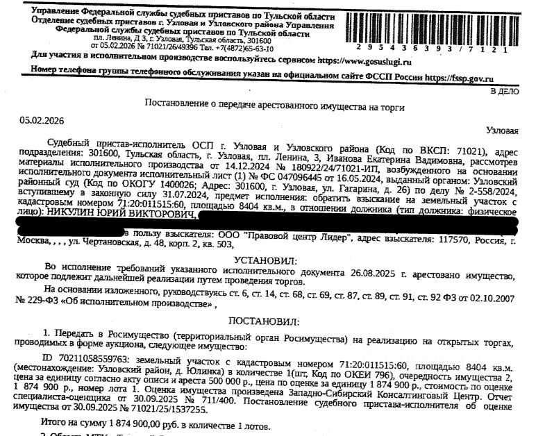 Земельный участок, земли населенных пунктов, ВРИ: для ведения личного подсобного хозяйства, площадь 8404 +/- 32 кв.м., кад.номер 71:20:011515:60, местоположение установлено относительно ориентира, расположенного за пределами участка.Ориентир жилой дом.Участок находится примерно в 20 метрах, по направлению на северо-запад от ориентира. Почтовый адрес ориентира: обл. Тульская, р-н Узловский, д. Юлинка, дом 37. В пределах з/у расположен объект недвижимости с кад.номером 71:20:000000:1604, сведениями о правообладателе Организатор торгов не располагает. Ограничения -см.извещение. Взыскатель: ООО "Правовой центр Лидер". Начальная цена: 1 874 900 (Один миллион восемьсот семьдесят четыре тысячи девятьсот) руб. 00 коп., без НДС. Задаток: 930 000 (Девятьсот тридцать тысяч) руб. 00 коп.; Шаг аукциона 1%: 18 749 (Восемнадцать тысяч семьсот сорок девять) руб. 00 коп.