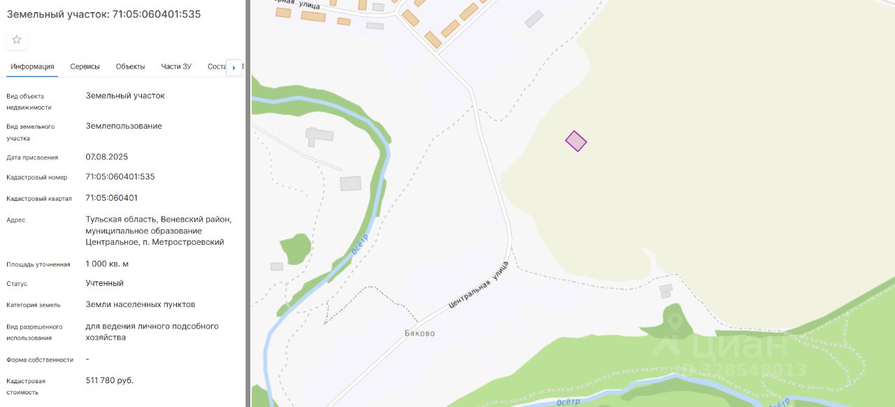 продажа земельного участка из земель населенных пунктов с кадастровым номером 71:05:060401:535, площадь 1000 кв. м, адрес: Тульская область, Веневский район, муниципальное образование Центральное, п. Метростроевский, вид разрешенного использования: для ведения личного подсобного хозяйства