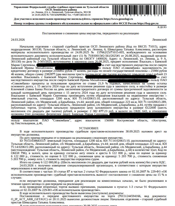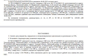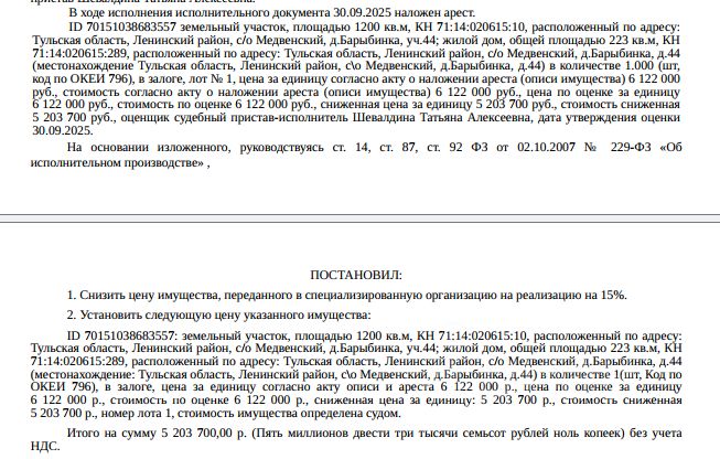 • Здание, назначение: жилое, наименование: индивидуальный жилой дом, кадастровый номер: 71:14:020615:289, площадь 223 кв.м., местоположение: Российская Федерация, Тульская обл., Ленинский район,с/п Медвенское, д. Барыбинка,д.44. Сведениями о зарегистрированных по данному адресу лицах Организатор торгов не располагает. • Земельный участок, категория земель: земли населенных пунктов, виды разрешенного использования: для индивидуального жилищного строительства, кадастровый номер: 71:14:020615:10, площадь 1200 +/- 24.2 кв.м., местоположение: Тульская область, Ленинский район, Медвенский с.о., дер. Барыбинка, уч. 44. Вид ограничений (обременений): ограничения прав на земельный участок, предусмотренные ст. 56 ЗК РФ. Залогодержатель: ПАО "Совкомбанк". Начальная цена: 5 203 700 (Пять миллионов двести три тысячи семьсот) руб. 00 коп., без НДС. Задаток: 250 000 (Двести пятьдесят тысяч) руб. 00 коп. Шаг аукциона 1%: 52 037 (Пятьдесят две тысячи тридцать семь) руб. 00 коп.