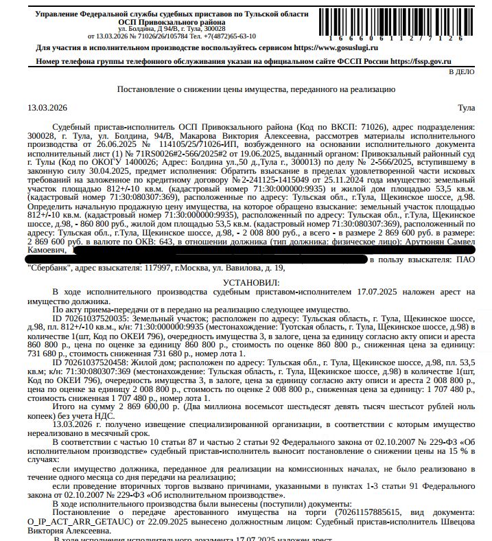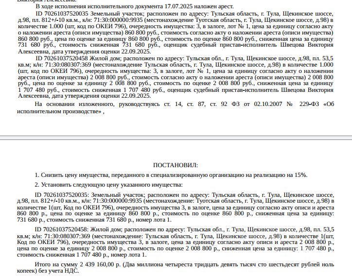 Здание, назначение: жилое, наименование: жилой дом, кадастровый номер: 71:30:080307:369, площадь 53,5 кв.м., местоположение: Тульская область, г Тула, ш Щекинское, д 98. Сведениями о зарегистрированных по данному адресу лицах Организатор торгов не располагает. Земельный участок, категория земель: земли населенных пунктов, виды разрешенного использования: для индивидуального жилищного строительства, кадастровый номер: 71:30:000000:9935, площадь 812 +/- 10 кв.м., местоположение: Тульская область, г. Тула, Привокзальный район, п. Косая Гора, ш. Щекинское, д. 98. Доп.информация - см.извещение. Залогодержатель: ПАО "Сбербанк России". Начальная цена: 2 439 160 (Два миллиона четыреста тридцать девять тысяч сто шестьдесят) руб. 00 коп., без НДС. Задаток: 120 000 (Сто двадцать тысяч) руб. 00 коп. Шаг аукциона 1%: 24 391 (Двадцать четыре тысячи триста девяносто один) руб. 60 коп.