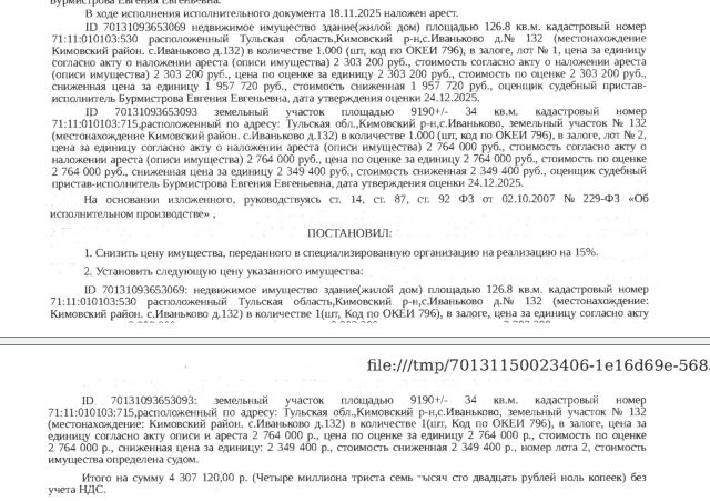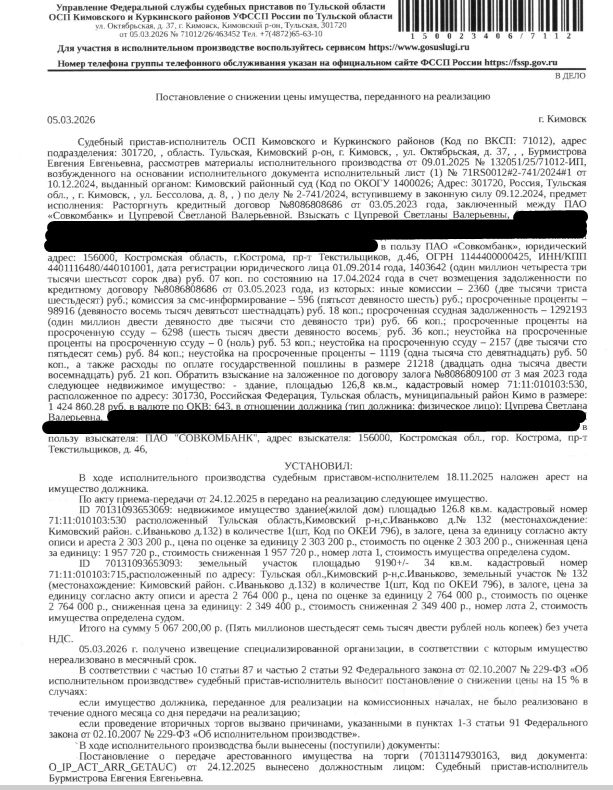 Здание, назначение: жилой дом, наименование: жилой дом, кадастровый номер: 71:11:010103:530, площадь 126,8 кв.м., местоположение: Тульская обл, м.р-н Кимовский, с/п Новольвовское, с. Иваньково, дом 132. Сведениями о зарегистрированных по данному адресу лицах Организатор торгов не располагает. Земельный участок, категория земель: земли населенных пунктов, виды разрешенного использования: для ведения личного подсобного хозяйства, кадастровый номер: 71:11:010103:715, площадь 9190 +/- 34 кв.м., адрес: Тульская обл, м.р-н Кимовский, с/п Новольвовское, с. Иваньково, з/у 132. Доп.информация - см.извещение. Залогодержатель: ПАО "Совкомбанк". Начальная цена: 4 307 120 (Четыре миллиона триста семь тысяч сто двадцать) руб. 00 коп., без НДС. Задаток: 210 000 (Двести десять тысяч) руб. 00 коп. Шаг аукциона 1%: 43 071 (Сорок три тысячи семьдесят один) руб. 20 коп.