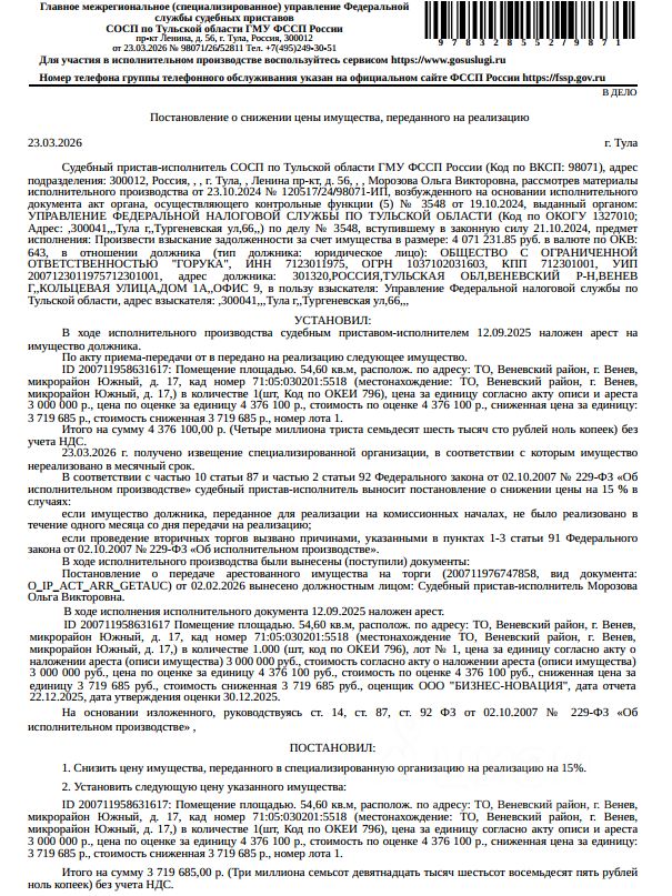 Помещение, назначение: нежилое, наименование: помещение, площадь 54,6 кв.м, кадастровый номер 71:05:030201:5518, местоположение: Тульская область, Веневский район, город Венев, микрорайон Южный, д. 17. Вид ограничений (обременений): арест на основании постановления о наложении ареста на имущество налогоплательщика - организации 11 от 22.02.2024. Залогодержатель: УФНС по Тульской области. Начальная цена: 3 719 685 (Три миллиона семьсот девятнадцать тысяч шестьсот восемьдесят пять) руб. 00 коп., без НДС. Задаток: 180 000 (Сто восемьдесят тысяч) руб. 00 коп. Шаг аукциона 1%: 37 196 (Тридцать семь тысяч сто девяносто шесть) руб. 85 коп.