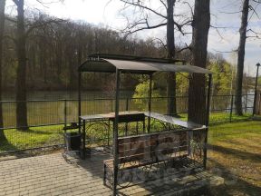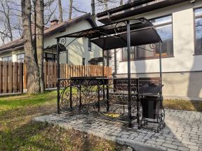 - Банкетный зал для проведения различного рода торжественных мероприятий, тренингов, семинаров и т.п. В основном зале комфортно размещаются 70-80 чел, предусмотрены 2 санузла и гардеробная. Оборудованы два помещения для готовки и доготовки (предполагалось привлечение специализированных кейтэренговых компаний), а также отдельный санузел и комната для персонала. Уличная веранда обустроена мангалом с печью из кирпича для приготовления на открытом огне.