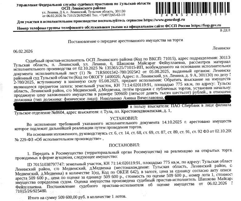 Земельный участок, категория земель: земли населенных пунктов, виды разрешенного использования: для ведения личного подсобного хозяйства, площадь 775 +/- 10 кв.м., кадастровый номер 71:14:020119:91, адрес: Российская Федерация, Тульская область, г.о. город Тула, д Медвенка. Вид ограничений (обременений): ограничения прав на земельный участок, предусмотренные ст. 56 ЗК РФ. Залогодержатель: ПАО "Сбербанк России". Начальная цена: 509 600 (Пятьсот девять тысяч шестьсот) руб. 00 коп., без НДС. Задаток: 20 000 (Двадцать тысяч) руб. 00 коп. Шаг аукциона 1%: 5 096 (Пять тысяч девяносто шесть) руб. 00 коп.