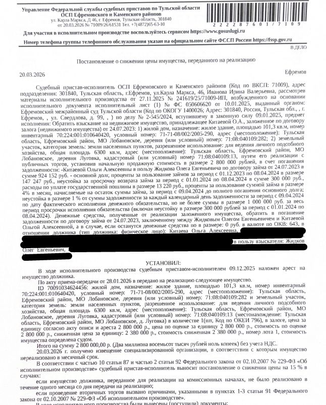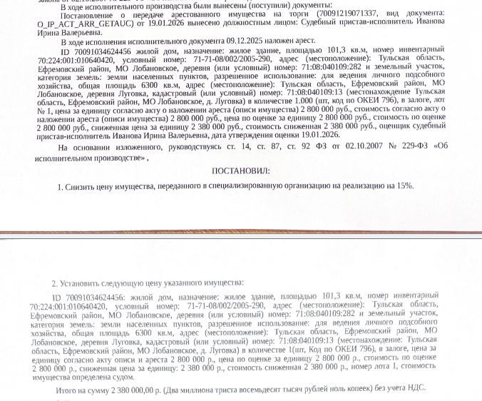• Здание, назначение: жилой дом, наименование: жилой дом, кадастровый номер 71:08:040109:282, площадь 101,3 кв.м., местоположение: Тульская область, городской округ город Ефремов, деревня Луговка, дом 49. Сведениями о зарегистрированных по данному адресу лицах Организатор торгов не располагает. • Земельный участок, категория земель: земли населенных пунктов, виды разрешенного использования: для ведения личного подсобного хозяйства, кадастровый номер 71:08:040109:13, площадь 6300 кв.м., местоположение установлено относительно ориентира, расположенного в границах участка. Почтовый адрес ориентира: обл. Тульская, р-н Ефремовский, с/о Лобановский, д. Луговка. Вид ограничений (обременений): ограничения прав на земельный участок, предусмотренные ст. 56 ЗК РФ. Залогодержатель: Жидков О.Е. Начальная цена: 2 380 000 (Два миллиона триста восемьдесят тысяч) руб. 00 коп., без НДС. Задаток: 110 000 (Сто десять тысяч) руб. 00 коп. Шаг аукциона 1%: 23 800 (Двадцать три тысячи восемьсот) руб. 00 коп.