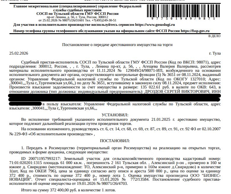 Земельный участок, категория земель: земли сельскохозяйственного назначения, виды разрешенного использования: для сельскохозяйственного производства, площадь 61000 +/- 2161 кв.м., кадастровый номер 71:01:020201:1315, местоположение: Тульская область, Алексинский район, примерно в 160 м южнее д. Свиридово. Взыскатель: УФНС по Тульской области. Начальная цена: 372 400 (Триста семьдесят две тысячи четыреста) руб. 00 коп., без НДС. Задаток: 180 000 (Сто восемьдесят тысяч) руб. 00 коп.; Шаг аукциона 1%: 3 724 (Три тысячи семьсот двадцать четыре) руб. 00 коп.