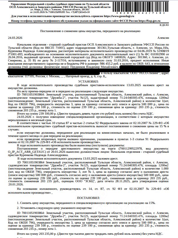 Земельный участок, категория земель: земли населенных пунктов, виды разрешенного использования: для ведения садоводства и огородничества, площадь 1200 кв.м., кадастровый номер 71:24:040305:476, местоположение: Российская Федерация, Тульская область, городской округ город Алексин, г. Алексин, садовое товарищество Дружба-2, з/у 125. Особые отметки: Граница земельного участка не установлена в соответствии с требованиями земельного законодательства. СМ.ИЗВЕЩЕНИЕ. На участке есть деревянная постройка. Взыскатель: ООО "РЕСО-Лизинг". Начальная цена: 203 235 (Двести три тысячи двести тридцать пять) руб. 00 коп., без НДС. Задаток: 100 000 (Сто тысяч) руб. 00 коп.; Шаг аукциона 1%: 2 032 (Две тысячи тридцать два) руб. 35 коп.