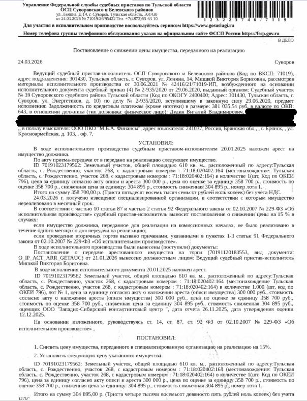 Земельный участок, категория земель: земли населенных пунктов, виды разрешенного использования: для ведения личного подсобного хозяйства, площадь 610 +/- 8.64 кв.м., кадастровый номер 71:18:020402:164, местоположение: Российская Федерация, Тульская область, Суворовский Муниципальный Район, Сельское Поселение Северо-Западное, с. Рождествено, участок 268. Земельный участок полностью расположен в границах зоны с реестровым номером 71:18-6.1139 от 09.01.2024, ограничение использования земельного участка в пределах зоны. Вид ограничений (обременений): ограничения прав на земельный участок, предусмотренные ст. 56 ЗК РФ. Взыскатель: ООО ПКО "М.Б.А. Финансы". Начальная цена: 304 895 (Триста четыре тысячи восемьсот девяносто пять) руб. 00 коп., без НДС. Задаток: 150 000 (Сто пятьдесят тысяч) руб. 00 коп.; Шаг аукциона 1%: 3 048 (Три тысячи сорок восемь) руб. 95 коп.