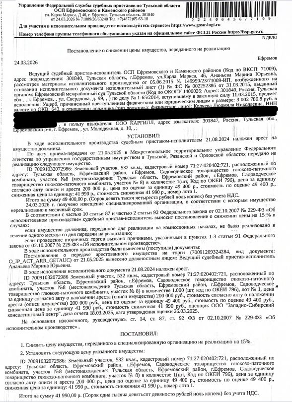Земельный участок, категория земель: земли населенных пунктов, виды разрешенного использования: для садоводства, площадь 532 кв.м., кадастровый номер 71:27:020402:721, местоположение: Тульская область, Ефремовский район, г.Ефремов, Садоводческое товарищество глюкозо-паточного комбината, участок 8. Особые отметки: Граница земельного участка не установлена в соответствии с требованиями земельного законодательства. СМ.ИЗВЕЩЕНИЕ. Взыскатель: ООО "КАРГИЛЛ". Начальная цена: 41 990 (Сорок одна тысяча девятьсот девяносто) руб. 00 коп., без НДС. Задаток: 15 000 (Пятнадцать тысяч) руб. 00 коп.; Шаг аукциона 1%: 419 (Четыреста девятнадцать) руб. 90 коп.