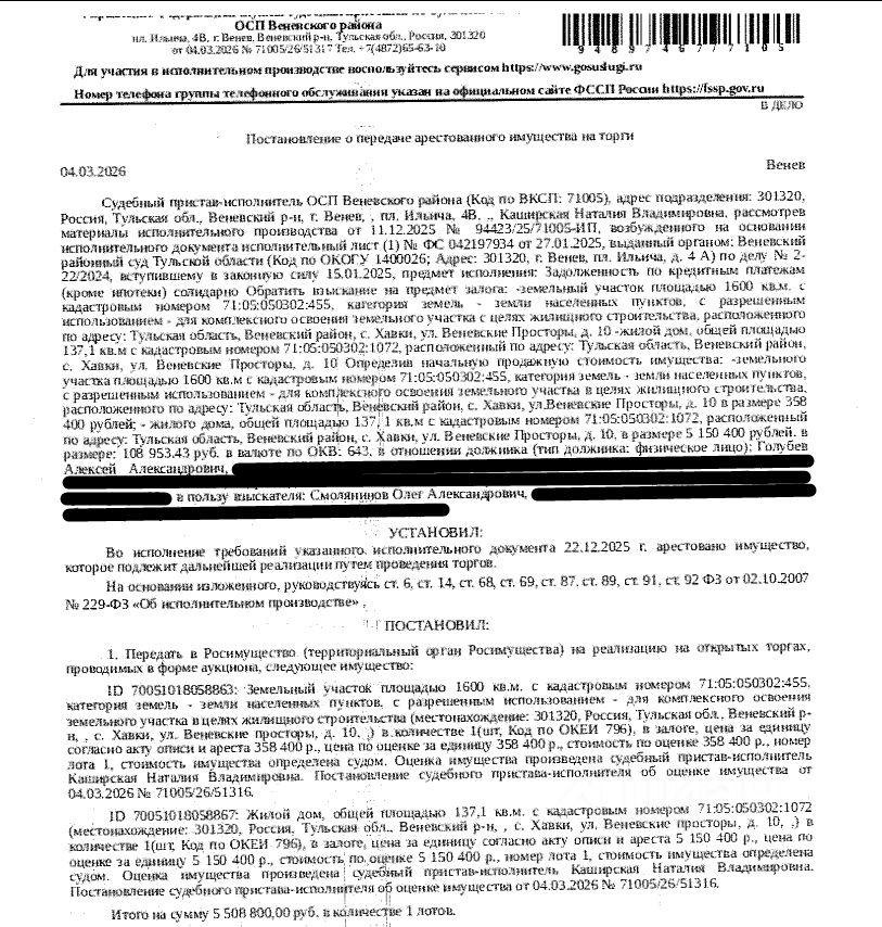 Здание, жилой дом, жилой дом с мансардой, пл. 137,1 кв.м., к.н. 71:05:050302:1072, адрес: Тульская область, МО Веневский, село Хавки, улица Веневские просторы, дом 10. Сведениями о зарег-х по данному адресу лицах Организатор торгов не располагает. Земельный участок, земли населенных пунктов, ВРИ: для комплексного освоения з/у в целях жил.строительства, пл. 1600 +/- 28 кв.м., к.н. 71:05:050302:455, местоположение: Тульская область, Веневский район, МО Гурьевское, с. Хавки, ул. Веневские Просторы, на земельном участке расположен жилой дом 10. См. Извещение. Вид ограничений (обременений): ограничения прав на земельный участок, предусмотренные ст. 56 ЗК РФ. Залогодержатель: Смолянинов О.А. Согласно выписке ЕГРН имущество также находится в залоге у Кульпина Р.Ю. Начальная цена: 5 508 800 (Пять миллионов пятьсот восемь тысяч восемьсот) руб. 00 коп., без НДС. Задаток: 270 000 (Двести семьдесят тысяч) руб. 00 коп. Шаг аукциона 1%: 55 088 (Пятьдесят пять тысяч восемьдесят восемь) руб. 00 коп.