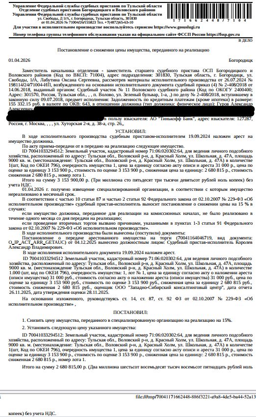 Земельный участок, категория земель: земли населенных пунктов, виды разрешенного использования: для ведения личного подсобного хозяйства, площадь 9000 кв.м., кадастровый номер 71:06:020302:64, местоположение установлено относительно ориентира, расположенного за пределами участка.Ориентир жилой дом.Участок находится примерно в 260 м, по направлению на восток от ориентира. Почтовый адрес ориентира: обл. Тульская, р-н Воловский, д. Красный Холм, ул. Школьная, дом 47а. Особые отметки: Граница земельного участка не установлена в соответствии с требованиями земельного законодательства. СМ.ИЗВЕЩЕНИЕ. Взыскатель: АО "Тинькофф банк". Начальная цена: 2 680 815 (Два миллиона шестьсот восемьдесят тысяч восемьсот пятнадцать) руб. 00 коп., без НДС. Задаток: 1 300 000 (Один миллион триста тысяч) руб. 00 коп.; Шаг аукциона 1%: 26 808 (Двадцать шесть тысяч восемьсот восемь) руб. 15 коп.