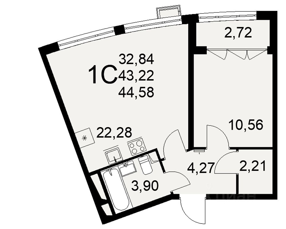 Продается 1-комн. квартира, 44,58 м²