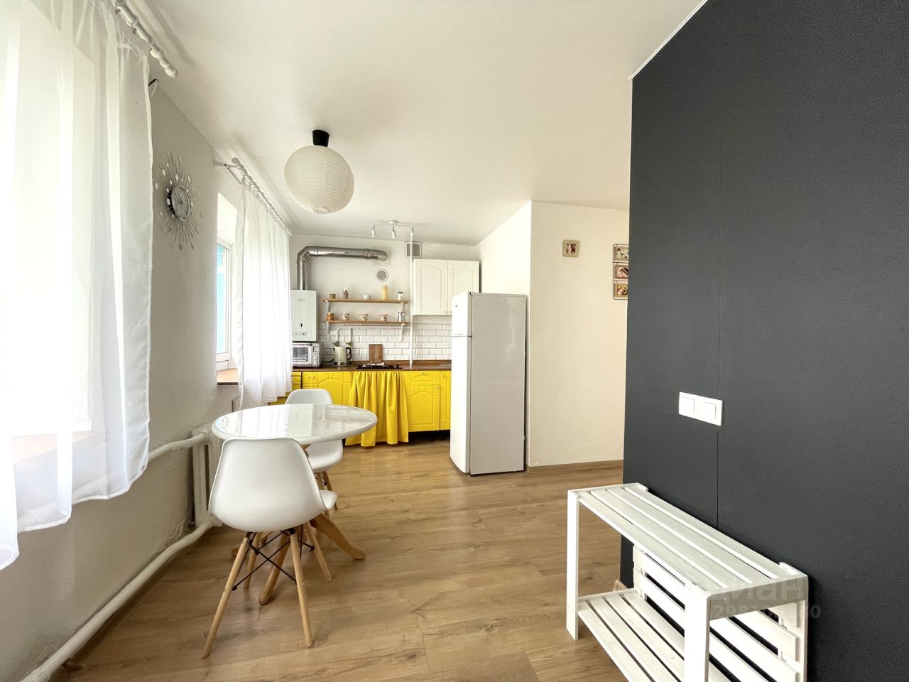 Планировка квартиры свободная: большая кухня-гостиная, вместительный коридор с гардеробом и отдельная спальная комната с модными стеллажами и плетёным креслом для отдыха.