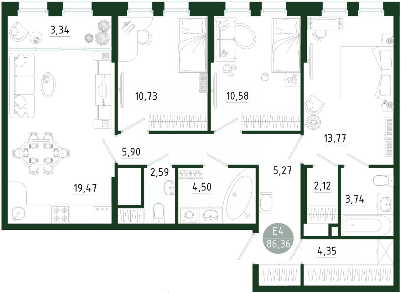 Продаётся 3-комнатная квартира в строящемся доме (Позиция 1), срок сдачи: III-кв. 2029, общей площадью 85.59 кв.м., на 1 этаже. Новый жилой комплекс в г. Тула "Платон Парк" от застройщика ООО "СЗ "МОНОЛИТ""