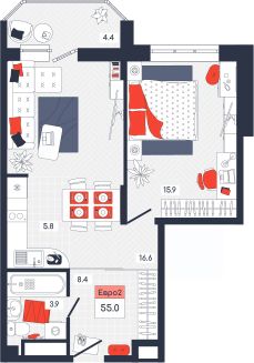 Продаётся 2-комнатная квартира в строящемся доме (Дом 20), срок сдачи: IV-кв. 2025, общей площадью 55 кв.м., на 14 этаже. Расположение, транспортная доступность Новый жилой комплекс "Юго-Восточный" строится в Туле, в 3,5 км от центра города. Благодаря удачным транспортным развязкам, автолюбители смогут доехать до центральных кварталов примерно за 5 10 минут, составив наиболее быстрый и удобный маршрут с учетом загруженности дорог. Проблем с мобильностью не возникнет и у пассажиров общественного транспорта. Рядом с домом расположены остановки автобусов и маршрутных такси, которые быстро довезут до любого района города. Так, чтобы добраться до центра, следует дойти пешком до остановки "Медтехника", где останавливается маршрутное такси, доезжающее до центральных кварталов всего за 7 8 минут. Инфраструктура Район, где возводится новый жилой комплекс, активно застраивается, и сеть инфраструктуры сов временем будет расширяться. Но и сейчас все, что нужно для комфортной жизни в городе, находится недалеко от жилого комплекса. В шаговой доступности расположены продуктовые магазины: "Виктория", "Овощи-фрукты", Магазин рыбы и мяса птицы, магазин мяса и колбас "У Максима", супермаркеты "Дикси", "Пятерочка", "SPAR". Неподалеку находится гипермаркет "Линия", крупный торговый центр, в котором расположены отделения банков, гипермаркет "Глобус", салон оптики, мебельный магазин "Столплит", зоомагазин "Четыре лапы" и пр. В соседнем здании находится строительный гипермаркет "Леруа Мерлен", за ним крупный магазин товаров для спорта, туризма и активного отдыха "Декатлон".Недалеко от жилого комплекса открыты кафе и рестораны: кофейня "Bonape", пиццерия "Культура", кафе "Вкуснов", кафе быстрого обслуживания "Rapido", ресторан "У фонтана" и пр.В районе есть аптеки, поликлиники, диагностические центры. В шаговой доступности от жилого комплекса расположено несколько детских садиков, в том числе, садик комбинированного вида "Алые паруса". Есть дошкольные отделения, входящие в состав образовательных центров, Центры развития ребенка. Поблизости расположены средние школы, в том числе, школа для детей с ОВЗ. Рядом с жилым комплексом находится Тульская Духовная Семинария и Суворовское училище. Надежность застройщик: достраивает объект ООО Ин-Групп.АрхитектураЖилой комплекс будет представлен 19 монолитно-кирпичными корпусами переменной этажности, выполненными в едином архитектурном стиле. При строительстве ЖК "Юго-Восточный" применяются современные материалы высокого качества, которые обеспечивают надежность домов и комфортный микроклимат в помещениях. Каждая секция оснащается современными лифтами. Помещения общего пользования отделываются экологичными материалами. Квартиры предлагаются однокомнатные (от 43,9 кв. м), двухкомнатные (от 45,8 кв. м), трехкомнатные (от 60,4 кв. м) и четырехкомнатные (от 87,2 кв. м), а также уютные студии (от 28,9 кв. м).На внутренней территории проводится комплексное благоустройство: озеленение, организация игровых площадок, мест для отдыха и заня
