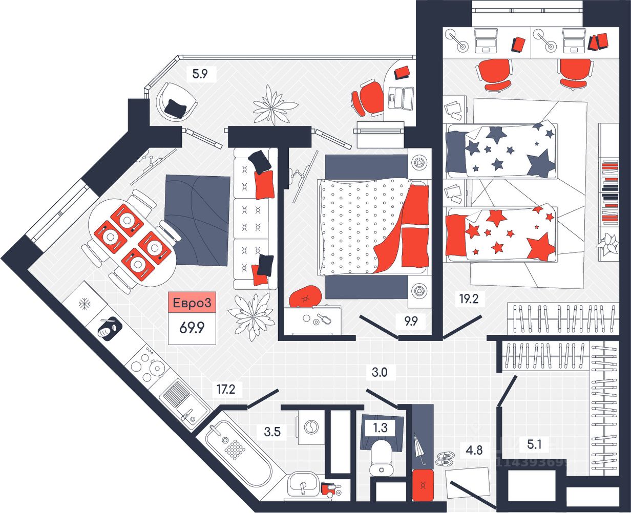 Продаётся 3-комнатная квартира в строящемся доме (Дом 20), срок сдачи: IV-кв. 2025, общей площадью 69.9 кв.м., на 11 этаже. Расположение, транспортная доступность Новый жилой комплекс "Юго-Восточный" строится в Туле, в 3,5 км от центра города. Благодаря удачным транспортным развязкам, автолюбители смогут доехать до центральных кварталов примерно за 5 10 минут, составив наиболее быстрый и удобный маршрут с учетом загруженности дорог. Проблем с мобильностью не возникнет и у пассажиров общественного транспорта. Рядом с домом расположены остановки автобусов и маршрутных такси, которые быстро довезут до любого района города. Так, чтобы добраться до центра, следует дойти пешком до остановки "Медтехника", где останавливается маршрутное такси, доезжающее до центральных кварталов всего за 7 8 минут. Инфраструктура Район, где возводится новый жилой комплекс, активно застраивается, и сеть инфраструктуры сов временем будет расширяться. Но и сейчас все, что нужно для комфортной жизни в городе, находится недалеко от жилого комплекса. В шаговой доступности расположены продуктовые магазины: "Виктория", "Овощи-фрукты", Магазин рыбы и мяса птицы, магазин мяса и колбас "У Максима", супермаркеты "Дикси", "Пятерочка", "SPAR". Неподалеку находится гипермаркет "Линия", крупный торговый центр, в котором расположены отделения банков, гипермаркет "Глобус", салон оптики, мебельный магазин "Столплит", зоомагазин "Четыре лапы" и пр. В соседнем здании находится строительный гипермаркет "Леруа Мерлен", за ним крупный магазин товаров для спорта, туризма и активного отдыха "Декатлон".Недалеко от жилого комплекса открыты кафе и рестораны: кофейня "Bonape", пиццерия "Культура", кафе "Вкуснов", кафе быстрого обслуживания "Rapido", ресторан "У фонтана" и пр.В районе есть аптеки, поликлиники, диагностические центры. В шаговой доступности от жилого комплекса расположено несколько детских садиков, в том числе, садик комбинированного вида "Алые паруса". Есть дошкольные отделения, входящие в состав образовательных центров, Центры развития ребенка. Поблизости расположены средние школы, в том числе, школа для детей с ОВЗ. Рядом с жилым комплексом находится Тульская Духовная Семинария и Суворовское училище. Надежность застройщик: достраивает объект ООО Ин-Групп.АрхитектураЖилой комплекс будет представлен 19 монолитно-кирпичными корпусами переменной этажности, выполненными в едином архитектурном стиле. При строительстве ЖК "Юго-Восточный" применяются современные материалы высокого качества, которые обеспечивают надежность домов и комфортный микроклимат в помещениях. Каждая секция оснащается современными лифтами. Помещения общего пользования отделываются экологичными материалами. Квартиры предлагаются однокомнатные (от 43,9 кв. м), двухкомнатные (от 45,8 кв. м), трехкомнатные (от 60,4 кв. м) и четырехкомнатные (от 87,2 кв. м), а также уютные студии (от 28,9 кв. м).На внутренней территории проводится комплексное благоустройство: озеленение, организация игровых площадок, мест для отдыха и за