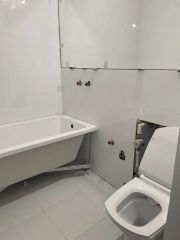 В ванной устроен аварийный слив с пола в канализацию, новая плитка и огромное зеркало. Установлена акриловая ванна, куплен унитаз.