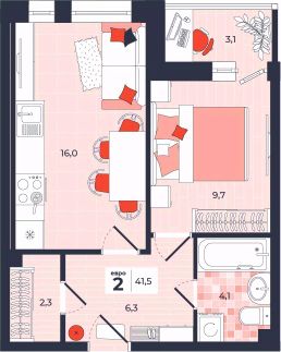 Продаётся 2-комнатная квартира в строящемся доме (Дом 30), срок сдачи: IV-кв. 2026, общей площадью 41.5 кв.м., на 2 этаже. Расположение, транспортная доступность Новый жилой комплекс "Юго-Восточный" строится в Туле, в 3,5 км от центра города. Благодаря удачным транспортным развязкам, автолюбители смогут доехать до центральных кварталов примерно за 5 10 минут, составив наиболее быстрый и удобный маршрут с учетом загруженности дорог. Проблем с мобильностью не возникнет и у пассажиров общественного транспорта. Рядом с домом расположены остановки автобусов и маршрутных такси, которые быстро довезут до любого района города. Так, чтобы добраться до центра, следует дойти пешком до остановки "Медтехника", где останавливается маршрутное такси, доезжающее до центральных кварталов всего за 7 8 минут. Инфраструктура Район, где возводится новый жилой комплекс, активно застраивается, и сеть инфраструктуры сов временем будет расширяться. Но и сейчас все, что нужно для комфортной жизни в городе, находится недалеко от жилого комплекса. В шаговой доступности расположены продуктовые магазины: "Виктория", "Овощи-фрукты", Магазин рыбы и мяса птицы, магазин мяса и колбас "У Максима", супермаркеты "Дикси", "Пятерочка", "SPAR". Неподалеку находится гипермаркет "Линия", крупный торговый центр, в котором расположены отделения банков, гипермаркет "Глобус", салон оптики, мебельный магазин "Столплит", зоомагазин "Четыре лапы" и пр. В соседнем здании находится строительный гипермаркет "Леруа Мерлен", за ним крупный магазин товаров для спорта, туризма и активного отдыха "Декатлон".Недалеко от жилого комплекса открыты кафе и рестораны: кофейня "Bonape", пиццерия "Культура", кафе "Вкуснов", кафе быстрого обслуживания "Rapido", ресторан "У фонтана" и пр.В районе есть аптеки, поликлиники, диагностические центры. В шаговой доступности от жилого комплекса расположено несколько детских садиков, в том числе, садик комбинированного вида "Алые паруса". Есть дошкольные отделения, входящие в состав образовательных центров, Центры развития ребенка. Поблизости расположены средние школы, в том числе, школа для детей с ОВЗ. Рядом с жилым комплексом находится Тульская Духовная Семинария и Суворовское училище. Надежность застройщик: достраивает объект ООО Ин-Групп.АрхитектураЖилой комплекс будет представлен 19 монолитно-кирпичными корпусами переменной этажности, выполненными в едином архитектурном стиле. При строительстве ЖК "Юго-Восточный" применяются современные материалы высокого качества, которые обеспечивают надежность домов и комфортный микроклимат в помещениях. Каждая секция оснащается современными лифтами. Помещения общего пользования отделываются экологичными материалами. Квартиры предлагаются однокомнатные (от 43,9 кв. м), двухкомнатные (от 45,8 кв. м), трехкомнатные (от 60,4 кв. м) и четырехкомнатные (от 87,2 кв. м), а также уютные студии (от 28,9 кв. м).На внутренней территории проводится комплексное благоустройство: озеленение, организация игровых площадок, мест для отдыха и зан