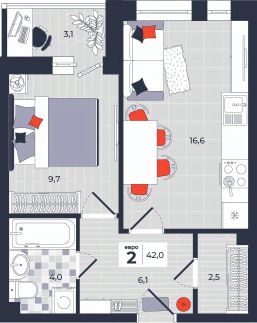 Продаётся 2-комнатная квартира в строящемся доме (Дом 30), срок сдачи: IV-кв. 2026, общей площадью 42 кв.м., на 3 этаже. Расположение, транспортная доступность Новый жилой комплекс "Юго-Восточный" строится в Туле, в 3,5 км от центра города. Благодаря удачным транспортным развязкам, автолюбители смогут доехать до центральных кварталов примерно за 5 10 минут, составив наиболее быстрый и удобный маршрут с учетом загруженности дорог. Проблем с мобильностью не возникнет и у пассажиров общественного транспорта. Рядом с домом расположены остановки автобусов и маршрутных такси, которые быстро довезут до любого района города. Так, чтобы добраться до центра, следует дойти пешком до остановки "Медтехника", где останавливается маршрутное такси, доезжающее до центральных кварталов всего за 7 8 минут. Инфраструктура Район, где возводится новый жилой комплекс, активно застраивается, и сеть инфраструктуры сов временем будет расширяться. Но и сейчас все, что нужно для комфортной жизни в городе, находится недалеко от жилого комплекса. В шаговой доступности расположены продуктовые магазины: "Виктория", "Овощи-фрукты", Магазин рыбы и мяса птицы, магазин мяса и колбас "У Максима", супермаркеты "Дикси", "Пятерочка", "SPAR". Неподалеку находится гипермаркет "Линия", крупный торговый центр, в котором расположены отделения банков, гипермаркет "Глобус", салон оптики, мебельный магазин "Столплит", зоомагазин "Четыре лапы" и пр. В соседнем здании находится строительный гипермаркет "Леруа Мерлен", за ним крупный магазин товаров для спорта, туризма и активного отдыха "Декатлон".Недалеко от жилого комплекса открыты кафе и рестораны: кофейня "Bonape", пиццерия "Культура", кафе "Вкуснов", кафе быстрого обслуживания "Rapido", ресторан "У фонтана" и пр.В районе есть аптеки, поликлиники, диагностические центры. В шаговой доступности от жилого комплекса расположено несколько детских садиков, в том числе, садик комбинированного вида "Алые паруса". Есть дошкольные отделения, входящие в состав образовательных центров, Центры развития ребенка. Поблизости расположены средние школы, в том числе, школа для детей с ОВЗ. Рядом с жилым комплексом находится Тульская Духовная Семинария и Суворовское училище. Надежность застройщик: достраивает объект ООО Ин-Групп.АрхитектураЖилой комплекс будет представлен 19 монолитно-кирпичными корпусами переменной этажности, выполненными в едином архитектурном стиле. При строительстве ЖК "Юго-Восточный" применяются современные материалы высокого качества, которые обеспечивают надежность домов и комфортный микроклимат в помещениях. Каждая секция оснащается современными лифтами. Помещения общего пользования отделываются экологичными материалами. Квартиры предлагаются однокомнатные (от 43,9 кв. м), двухкомнатные (от 45,8 кв. м), трехкомнатные (от 60,4 кв. м) и четырехкомнатные (от 87,2 кв. м), а также уютные студии (от 28,9 кв. м).На внутренней территории проводится комплексное благоустройство: озеленение, организация игровых площадок, мест для отдыха и занят