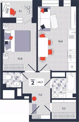 Продаётся 2-комнатная квартира в строящемся доме (Дом 30), срок сдачи: IV-кв. 2026, общей площадью 46.3 кв.м., на 14 этаже. Расположение, транспортная доступность Новый жилой комплекс "Юго-Восточный" строится в Туле, в 3,5 км от центра города. Благодаря удачным транспортным развязкам, автолюбители смогут доехать до центральных кварталов примерно за 5 10 минут, составив наиболее быстрый и удобный маршрут с учетом загруженности дорог. Проблем с мобильностью не возникнет и у пассажиров общественного транспорта. Рядом с домом расположены остановки автобусов и маршрутных такси, которые быстро довезут до любого района города. Так, чтобы добраться до центра, следует дойти пешком до остановки "Медтехника", где останавливается маршрутное такси, доезжающее до центральных кварталов всего за 7 8 минут. Инфраструктура Район, где возводится новый жилой комплекс, активно застраивается, и сеть инфраструктуры сов временем будет расширяться. Но и сейчас все, что нужно для комфортной жизни в городе, находится недалеко от жилого комплекса. В шаговой доступности расположены продуктовые магазины: "Виктория", "Овощи-фрукты", Магазин рыбы и мяса птицы, магазин мяса и колбас "У Максима", супермаркеты "Дикси", "Пятерочка", "SPAR". Неподалеку находится гипермаркет "Линия", крупный торговый центр, в котором расположены отделения банков, гипермаркет "Глобус", салон оптики, мебельный магазин "Столплит", зоомагазин "Четыре лапы" и пр. В соседнем здании находится строительный гипермаркет "Леруа Мерлен", за ним крупный магазин товаров для спорта, туризма и активного отдыха "Декатлон".Недалеко от жилого комплекса открыты кафе и рестораны: кофейня "Bonape", пиццерия "Культура", кафе "Вкуснов", кафе быстрого обслуживания "Rapido", ресторан "У фонтана" и пр.В районе есть аптеки, поликлиники, диагностические центры. В шаговой доступности от жилого комплекса расположено несколько детских садиков, в том числе, садик комбинированного вида "Алые паруса". Есть дошкольные отделения, входящие в состав образовательных центров, Центры развития ребенка. Поблизости расположены средние школы, в том числе, школа для детей с ОВЗ. Рядом с жилым комплексом находится Тульская Духовная Семинария и Суворовское училище. Надежность застройщик: достраивает объект ООО Ин-Групп.АрхитектураЖилой комплекс будет представлен 19 монолитно-кирпичными корпусами переменной этажности, выполненными в едином архитектурном стиле. При строительстве ЖК "Юго-Восточный" применяются современные материалы высокого качества, которые обеспечивают надежность домов и комфортный микроклимат в помещениях. Каждая секция оснащается современными лифтами. Помещения общего пользования отделываются экологичными материалами. Квартиры предлагаются однокомнатные (от 43,9 кв. м), двухкомнатные (от 45,8 кв. м), трехкомнатные (от 60,4 кв. м) и четырехкомнатные (от 87,2 кв. м), а также уютные студии (от 28,9 кв. м).На внутренней территории проводится комплексное благоустройство: озеленение, организация игровых площадок, мест для отдыха и за