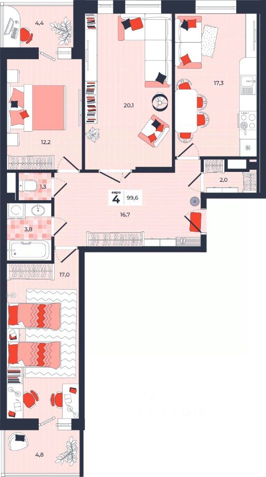 Продаётся 4-комнатная квартира в строящемся доме (Дом 30), срок сдачи: IV-кв. 2026, общей площадью 99.6 кв.м., на 7 этаже. Расположение, транспортная доступность Новый жилой комплекс "Юго-Восточный" строится в Туле, в 3,5 км от центра города. Благодаря удачным транспортным развязкам, автолюбители смогут доехать до центральных кварталов примерно за 5 10 минут, составив наиболее быстрый и удобный маршрут с учетом загруженности дорог. Проблем с мобильностью не возникнет и у пассажиров общественного транспорта. Рядом с домом расположены остановки автобусов и маршрутных такси, которые быстро довезут до любого района города. Так, чтобы добраться до центра, следует дойти пешком до остановки "Медтехника", где останавливается маршрутное такси, доезжающее до центральных кварталов всего за 7 8 минут. Инфраструктура Район, где возводится новый жилой комплекс, активно застраивается, и сеть инфраструктуры сов временем будет расширяться. Но и сейчас все, что нужно для комфортной жизни в городе, находится недалеко от жилого комплекса. В шаговой доступности расположены продуктовые магазины: "Виктория", "Овощи-фрукты", Магазин рыбы и мяса птицы, магазин мяса и колбас "У Максима", супермаркеты "Дикси", "Пятерочка", "SPAR". Неподалеку находится гипермаркет "Линия", крупный торговый центр, в котором расположены отделения банков, гипермаркет "Глобус", салон оптики, мебельный магазин "Столплит", зоомагазин "Четыре лапы" и пр. В соседнем здании находится строительный гипермаркет "Леруа Мерлен", за ним крупный магазин товаров для спорта, туризма и активного отдыха "Декатлон".Недалеко от жилого комплекса открыты кафе и рестораны: кофейня "Bonape", пиццерия "Культура", кафе "Вкуснов", кафе быстрого обслуживания "Rapido", ресторан "У фонтана" и пр.В районе есть аптеки, поликлиники, диагностические центры. В шаговой доступности от жилого комплекса расположено несколько детских садиков, в том числе, садик комбинированного вида "Алые паруса". Есть дошкольные отделения, входящие в состав образовательных центров, Центры развития ребенка. Поблизости расположены средние школы, в том числе, школа для детей с ОВЗ. Рядом с жилым комплексом находится Тульская Духовная Семинария и Суворовское училище. Надежность застройщик: достраивает объект ООО Ин-Групп.АрхитектураЖилой комплекс будет представлен 19 монолитно-кирпичными корпусами переменной этажности, выполненными в едином архитектурном стиле. При строительстве ЖК "Юго-Восточный" применяются современные материалы высокого качества, которые обеспечивают надежность домов и комфортный микроклимат в помещениях. Каждая секция оснащается современными лифтами. Помещения общего пользования отделываются экологичными материалами. Квартиры предлагаются однокомнатные (от 43,9 кв. м), двухкомнатные (от 45,8 кв. м), трехкомнатные (от 60,4 кв. м) и четырехкомнатные (от 87,2 кв. м), а также уютные студии (от 28,9 кв. м).На внутренней территории проводится комплексное благоустройство: озеленение, организация игровых площадок, мест для отдыха и зан