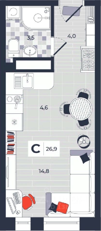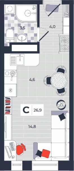 Продаётся студия в строящемся доме (Дом 30), срок сдачи: IV-кв. 2026, общей площадью 26.9 кв.м., на 11 этаже. Расположение, транспортная доступность Новый жилой комплекс "Юго-Восточный" строится в Туле, в 3,5 км от центра города. Благодаря удачным транспортным развязкам, автолюбители смогут доехать до центральных кварталов примерно за 5 10 минут, составив наиболее быстрый и удобный маршрут с учетом загруженности дорог. Проблем с мобильностью не возникнет и у пассажиров общественного транспорта. Рядом с домом расположены остановки автобусов и маршрутных такси, которые быстро довезут до любого района города. Так, чтобы добраться до центра, следует дойти пешком до остановки "Медтехника", где останавливается маршрутное такси, доезжающее до центральных кварталов всего за 7 8 минут. Инфраструктура Район, где возводится новый жилой комплекс, активно застраивается, и сеть инфраструктуры сов временем будет расширяться. Но и сейчас все, что нужно для комфортной жизни в городе, находится недалеко от жилого комплекса. В шаговой доступности расположены продуктовые магазины: "Виктория", "Овощи-фрукты", Магазин рыбы и мяса птицы, магазин мяса и колбас "У Максима", супермаркеты "Дикси", "Пятерочка", "SPAR". Неподалеку находится гипермаркет "Линия", крупный торговый центр, в котором расположены отделения банков, гипермаркет "Глобус", салон оптики, мебельный магазин "Столплит", зоомагазин "Четыре лапы" и пр. В соседнем здании находится строительный гипермаркет "Леруа Мерлен", за ним крупный магазин товаров для спорта, туризма и активного отдыха "Декатлон".Недалеко от жилого комплекса открыты кафе и рестораны: кофейня "Bonape", пиццерия "Культура", кафе "Вкуснов", кафе быстрого обслуживания "Rapido", ресторан "У фонтана" и пр.В районе есть аптеки, поликлиники, диагностические центры. В шаговой доступности от жилого комплекса расположено несколько детских садиков, в том числе, садик комбинированного вида "Алые паруса". Есть дошкольные отделения, входящие в состав образовательных центров, Центры развития ребенка. Поблизости расположены средние школы, в том числе, школа для детей с ОВЗ. Рядом с жилым комплексом находится Тульская Духовная Семинария и Суворовское училище. Надежность застройщик: достраивает объект ООО Ин-Групп.АрхитектураЖилой комплекс будет представлен 19 монолитно-кирпичными корпусами переменной этажности, выполненными в едином архитектурном стиле. При строительстве ЖК "Юго-Восточный" применяются современные материалы высокого качества, которые обеспечивают надежность домов и комфортный микроклимат в помещениях. Каждая секция оснащается современными лифтами. Помещения общего пользования отделываются экологичными материалами. Квартиры предлагаются однокомнатные (от 43,9 кв. м), двухкомнатные (от 45,8 кв. м), трехкомнатные (от 60,4 кв. м) и четырехкомнатные (от 87,2 кв. м), а также уютные студии (от 28,9 кв. м).На внутренней территории проводится комплексное благоустройство: озеленение, организация игровых площадок, мест для отдыха и занятий спортом,