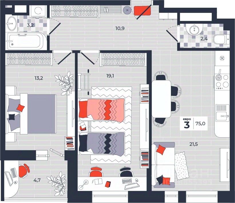 Продаётся 3-комнатная квартира в строящемся доме (Дом 30), срок сдачи: IV-кв. 2026, общей площадью 75 кв.м., на 11 этаже. Расположение, транспортная доступность Новый жилой комплекс "Юго-Восточный" строится в Туле, в 3,5 км от центра города. Благодаря удачным транспортным развязкам, автолюбители смогут доехать до центральных кварталов примерно за 5 10 минут, составив наиболее быстрый и удобный маршрут с учетом загруженности дорог. Проблем с мобильностью не возникнет и у пассажиров общественного транспорта. Рядом с домом расположены остановки автобусов и маршрутных такси, которые быстро довезут до любого района города. Так, чтобы добраться до центра, следует дойти пешком до остановки "Медтехника", где останавливается маршрутное такси, доезжающее до центральных кварталов всего за 7 8 минут. Инфраструктура Район, где возводится новый жилой комплекс, активно застраивается, и сеть инфраструктуры сов временем будет расширяться. Но и сейчас все, что нужно для комфортной жизни в городе, находится недалеко от жилого комплекса. В шаговой доступности расположены продуктовые магазины: "Виктория", "Овощи-фрукты", Магазин рыбы и мяса птицы, магазин мяса и колбас "У Максима", супермаркеты "Дикси", "Пятерочка", "SPAR". Неподалеку находится гипермаркет "Линия", крупный торговый центр, в котором расположены отделения банков, гипермаркет "Глобус", салон оптики, мебельный магазин "Столплит", зоомагазин "Четыре лапы" и пр. В соседнем здании находится строительный гипермаркет "Леруа Мерлен", за ним крупный магазин товаров для спорта, туризма и активного отдыха "Декатлон".Недалеко от жилого комплекса открыты кафе и рестораны: кофейня "Bonape", пиццерия "Культура", кафе "Вкуснов", кафе быстрого обслуживания "Rapido", ресторан "У фонтана" и пр.В районе есть аптеки, поликлиники, диагностические центры. В шаговой доступности от жилого комплекса расположено несколько детских садиков, в том числе, садик комбинированного вида "Алые паруса". Есть дошкольные отделения, входящие в состав образовательных центров, Центры развития ребенка. Поблизости расположены средние школы, в том числе, школа для детей с ОВЗ. Рядом с жилым комплексом находится Тульская Духовная Семинария и Суворовское училище. Надежность застройщик: достраивает объект ООО Ин-Групп.АрхитектураЖилой комплекс будет представлен 19 монолитно-кирпичными корпусами переменной этажности, выполненными в едином архитектурном стиле. При строительстве ЖК "Юго-Восточный" применяются современные материалы высокого качества, которые обеспечивают надежность домов и комфортный микроклимат в помещениях. Каждая секция оснащается современными лифтами. Помещения общего пользования отделываются экологичными материалами. Квартиры предлагаются однокомнатные (от 43,9 кв. м), двухкомнатные (от 45,8 кв. м), трехкомнатные (от 60,4 кв. м) и четырехкомнатные (от 87,2 кв. м), а также уютные студии (от 28,9 кв. м).На внутренней территории проводится комплексное благоустройство: озеленение, организация игровых площадок, мест для отдыха и заня