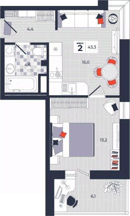 Продаётся 2-комнатная квартира в строящемся доме (Дом 30), срок сдачи: IV-кв. 2026, общей площадью 43.3 кв.м., на 12 этаже. Расположение, транспортная доступность Новый жилой комплекс "Юго-Восточный" строится в Туле, в 3,5 км от центра города. Благодаря удачным транспортным развязкам, автолюбители смогут доехать до центральных кварталов примерно за 5 10 минут, составив наиболее быстрый и удобный маршрут с учетом загруженности дорог. Проблем с мобильностью не возникнет и у пассажиров общественного транспорта. Рядом с домом расположены остановки автобусов и маршрутных такси, которые быстро довезут до любого района города. Так, чтобы добраться до центра, следует дойти пешком до остановки "Медтехника", где останавливается маршрутное такси, доезжающее до центральных кварталов всего за 7 8 минут. Инфраструктура Район, где возводится новый жилой комплекс, активно застраивается, и сеть инфраструктуры сов временем будет расширяться. Но и сейчас все, что нужно для комфортной жизни в городе, находится недалеко от жилого комплекса. В шаговой доступности расположены продуктовые магазины: "Виктория", "Овощи-фрукты", Магазин рыбы и мяса птицы, магазин мяса и колбас "У Максима", супермаркеты "Дикси", "Пятерочка", "SPAR". Неподалеку находится гипермаркет "Линия", крупный торговый центр, в котором расположены отделения банков, гипермаркет "Глобус", салон оптики, мебельный магазин "Столплит", зоомагазин "Четыре лапы" и пр. В соседнем здании находится строительный гипермаркет "Леруа Мерлен", за ним крупный магазин товаров для спорта, туризма и активного отдыха "Декатлон".Недалеко от жилого комплекса открыты кафе и рестораны: кофейня "Bonape", пиццерия "Культура", кафе "Вкуснов", кафе быстрого обслуживания "Rapido", ресторан "У фонтана" и пр.В районе есть аптеки, поликлиники, диагностические центры. В шаговой доступности от жилого комплекса расположено несколько детских садиков, в том числе, садик комбинированного вида "Алые паруса". Есть дошкольные отделения, входящие в состав образовательных центров, Центры развития ребенка. Поблизости расположены средние школы, в том числе, школа для детей с ОВЗ. Рядом с жилым комплексом находится Тульская Духовная Семинария и Суворовское училище. Надежность застройщик: достраивает объект ООО Ин-Групп.АрхитектураЖилой комплекс будет представлен 19 монолитно-кирпичными корпусами переменной этажности, выполненными в едином архитектурном стиле. При строительстве ЖК "Юго-Восточный" применяются современные материалы высокого качества, которые обеспечивают надежность домов и комфортный микроклимат в помещениях. Каждая секция оснащается современными лифтами. Помещения общего пользования отделываются экологичными материалами. Квартиры предлагаются однокомнатные (от 43,9 кв. м), двухкомнатные (от 45,8 кв. м), трехкомнатные (от 60,4 кв. м) и четырехкомнатные (от 87,2 кв. м), а также уютные студии (от 28,9 кв. м).На внутренней территории проводится комплексное благоустройство: озеленение, организация игровых площадок, мест для отдыха и за
