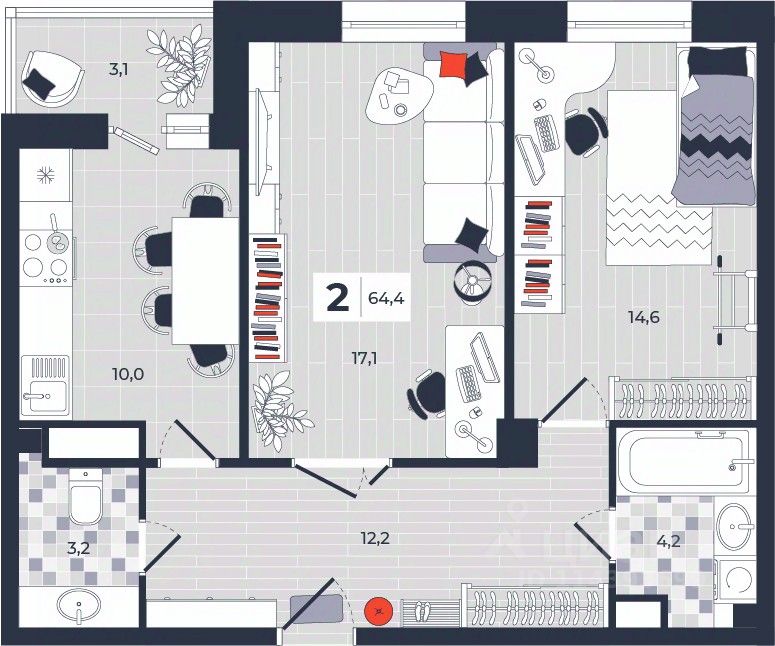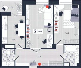 Продаётся 2-комнатная квартира в строящемся доме (Дом 30), срок сдачи: IV-кв. 2026, общей площадью 64.4 кв.м., на 13 этаже. Расположение, транспортная доступность Новый жилой комплекс "Юго-Восточный" строится в Туле, в 3,5 км от центра города. Благодаря удачным транспортным развязкам, автолюбители смогут доехать до центральных кварталов примерно за 5 10 минут, составив наиболее быстрый и удобный маршрут с учетом загруженности дорог. Проблем с мобильностью не возникнет и у пассажиров общественного транспорта. Рядом с домом расположены остановки автобусов и маршрутных такси, которые быстро довезут до любого района города. Так, чтобы добраться до центра, следует дойти пешком до остановки "Медтехника", где останавливается маршрутное такси, доезжающее до центральных кварталов всего за 7 8 минут. Инфраструктура Район, где возводится новый жилой комплекс, активно застраивается, и сеть инфраструктуры сов временем будет расширяться. Но и сейчас все, что нужно для комфортной жизни в городе, находится недалеко от жилого комплекса. В шаговой доступности расположены продуктовые магазины: "Виктория", "Овощи-фрукты", Магазин рыбы и мяса птицы, магазин мяса и колбас "У Максима", супермаркеты "Дикси", "Пятерочка", "SPAR". Неподалеку находится гипермаркет "Линия", крупный торговый центр, в котором расположены отделения банков, гипермаркет "Глобус", салон оптики, мебельный магазин "Столплит", зоомагазин "Четыре лапы" и пр. В соседнем здании находится строительный гипермаркет "Леруа Мерлен", за ним крупный магазин товаров для спорта, туризма и активного отдыха "Декатлон".Недалеко от жилого комплекса открыты кафе и рестораны: кофейня "Bonape", пиццерия "Культура", кафе "Вкуснов", кафе быстрого обслуживания "Rapido", ресторан "У фонтана" и пр.В районе есть аптеки, поликлиники, диагностические центры. В шаговой доступности от жилого комплекса расположено несколько детских садиков, в том числе, садик комбинированного вида "Алые паруса". Есть дошкольные отделения, входящие в состав образовательных центров, Центры развития ребенка. Поблизости расположены средние школы, в том числе, школа для детей с ОВЗ. Рядом с жилым комплексом находится Тульская Духовная Семинария и Суворовское училище. Надежность застройщик: достраивает объект ООО Ин-Групп.АрхитектураЖилой комплекс будет представлен 19 монолитно-кирпичными корпусами переменной этажности, выполненными в едином архитектурном стиле. При строительстве ЖК "Юго-Восточный" применяются современные материалы высокого качества, которые обеспечивают надежность домов и комфортный микроклимат в помещениях. Каждая секция оснащается современными лифтами. Помещения общего пользования отделываются экологичными материалами. Квартиры предлагаются однокомнатные (от 43,9 кв. м), двухкомнатные (от 45,8 кв. м), трехкомнатные (от 60,4 кв. м) и четырехкомнатные (от 87,2 кв. м), а также уютные студии (от 28,9 кв. м).На внутренней территории проводится комплексное благоустройство: озеленение, организация игровых площадок, мест для отдыха и за