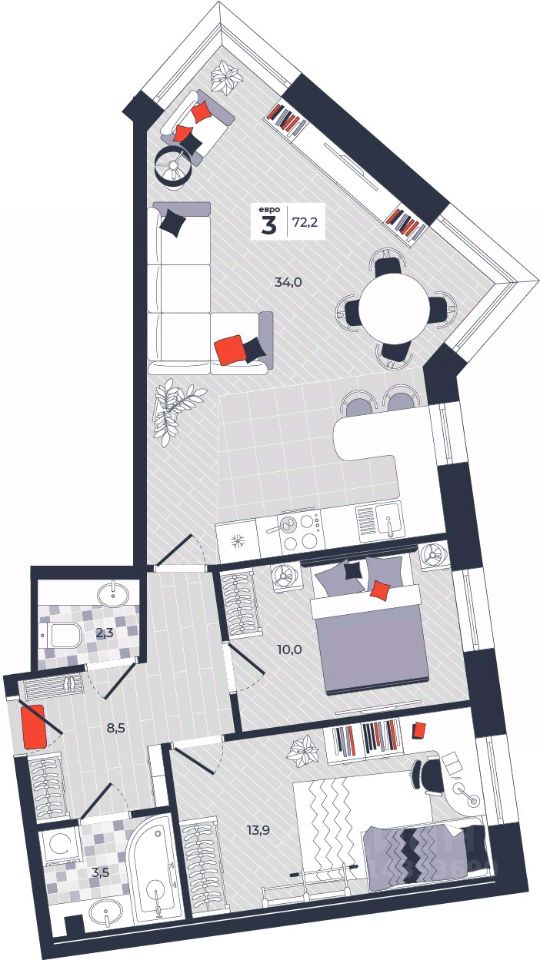Продаётся 3-комнатная квартира в строящемся доме (Дом 30), срок сдачи: IV-кв. 2026, общей площадью 72.2 кв.м., на 4 этаже. Расположение, транспортная доступность Новый жилой комплекс "Юго-Восточный" строится в Туле, в 3,5 км от центра города. Благодаря удачным транспортным развязкам, автолюбители смогут доехать до центральных кварталов примерно за 5 10 минут, составив наиболее быстрый и удобный маршрут с учетом загруженности дорог. Проблем с мобильностью не возникнет и у пассажиров общественного транспорта. Рядом с домом расположены остановки автобусов и маршрутных такси, которые быстро довезут до любого района города. Так, чтобы добраться до центра, следует дойти пешком до остановки "Медтехника", где останавливается маршрутное такси, доезжающее до центральных кварталов всего за 7 8 минут. Инфраструктура Район, где возводится новый жилой комплекс, активно застраивается, и сеть инфраструктуры сов временем будет расширяться. Но и сейчас все, что нужно для комфортной жизни в городе, находится недалеко от жилого комплекса. В шаговой доступности расположены продуктовые магазины: "Виктория", "Овощи-фрукты", Магазин рыбы и мяса птицы, магазин мяса и колбас "У Максима", супермаркеты "Дикси", "Пятерочка", "SPAR". Неподалеку находится гипермаркет "Линия", крупный торговый центр, в котором расположены отделения банков, гипермаркет "Глобус", салон оптики, мебельный магазин "Столплит", зоомагазин "Четыре лапы" и пр. В соседнем здании находится строительный гипермаркет "Леруа Мерлен", за ним крупный магазин товаров для спорта, туризма и активного отдыха "Декатлон".Недалеко от жилого комплекса открыты кафе и рестораны: кофейня "Bonape", пиццерия "Культура", кафе "Вкуснов", кафе быстрого обслуживания "Rapido", ресторан "У фонтана" и пр.В районе есть аптеки, поликлиники, диагностические центры. В шаговой доступности от жилого комплекса расположено несколько детских садиков, в том числе, садик комбинированного вида "Алые паруса". Есть дошкольные отделения, входящие в состав образовательных центров, Центры развития ребенка. Поблизости расположены средние школы, в том числе, школа для детей с ОВЗ. Рядом с жилым комплексом находится Тульская Духовная Семинария и Суворовское училище. Надежность застройщик: достраивает объект ООО Ин-Групп.АрхитектураЖилой комплекс будет представлен 19 монолитно-кирпичными корпусами переменной этажности, выполненными в едином архитектурном стиле. При строительстве ЖК "Юго-Восточный" применяются современные материалы высокого качества, которые обеспечивают надежность домов и комфортный микроклимат в помещениях. Каждая секция оснащается современными лифтами. Помещения общего пользования отделываются экологичными материалами. Квартиры предлагаются однокомнатные (от 43,9 кв. м), двухкомнатные (от 45,8 кв. м), трехкомнатные (от 60,4 кв. м) и четырехкомнатные (от 87,2 кв. м), а также уютные студии (от 28,9 кв. м).На внутренней территории проводится комплексное благоустройство: озеленение, организация игровых площадок, мест для отдыха и зан