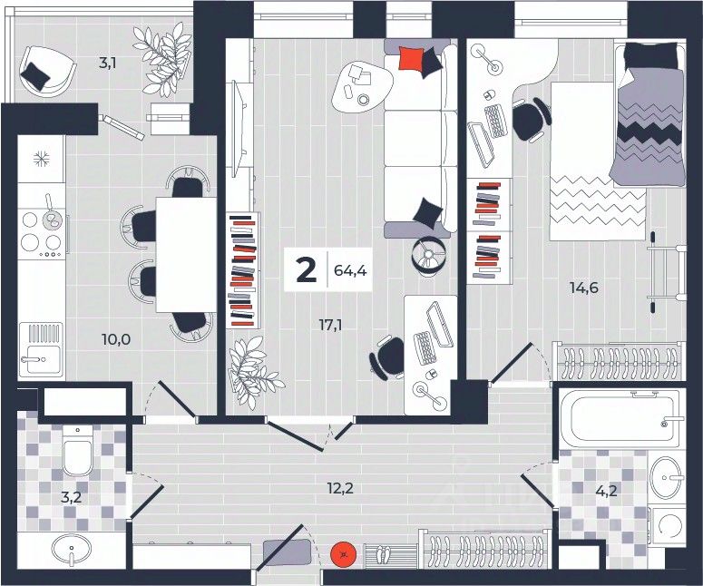Продаётся 2-комнатная квартира в строящемся доме (Дом 30), срок сдачи: IV-кв. 2026, общей площадью 64.4 кв.м., на 3 этаже. Расположение, транспортная доступность Новый жилой комплекс "Юго-Восточный" строится в Туле, в 3,5 км от центра города. Благодаря удачным транспортным развязкам, автолюбители смогут доехать до центральных кварталов примерно за 5 10 минут, составив наиболее быстрый и удобный маршрут с учетом загруженности дорог. Проблем с мобильностью не возникнет и у пассажиров общественного транспорта. Рядом с домом расположены остановки автобусов и маршрутных такси, которые быстро довезут до любого района города. Так, чтобы добраться до центра, следует дойти пешком до остановки "Медтехника", где останавливается маршрутное такси, доезжающее до центральных кварталов всего за 7 8 минут. Инфраструктура Район, где возводится новый жилой комплекс, активно застраивается, и сеть инфраструктуры сов временем будет расширяться. Но и сейчас все, что нужно для комфортной жизни в городе, находится недалеко от жилого комплекса. В шаговой доступности расположены продуктовые магазины: "Виктория", "Овощи-фрукты", Магазин рыбы и мяса птицы, магазин мяса и колбас "У Максима", супермаркеты "Дикси", "Пятерочка", "SPAR". Неподалеку находится гипермаркет "Линия", крупный торговый центр, в котором расположены отделения банков, гипермаркет "Глобус", салон оптики, мебельный магазин "Столплит", зоомагазин "Четыре лапы" и пр. В соседнем здании находится строительный гипермаркет "Леруа Мерлен", за ним крупный магазин товаров для спорта, туризма и активного отдыха "Декатлон".Недалеко от жилого комплекса открыты кафе и рестораны: кофейня "Bonape", пиццерия "Культура", кафе "Вкуснов", кафе быстрого обслуживания "Rapido", ресторан "У фонтана" и пр.В районе есть аптеки, поликлиники, диагностические центры. В шаговой доступности от жилого комплекса расположено несколько детских садиков, в том числе, садик комбинированного вида "Алые паруса". Есть дошкольные отделения, входящие в состав образовательных центров, Центры развития ребенка. Поблизости расположены средние школы, в том числе, школа для детей с ОВЗ. Рядом с жилым комплексом находится Тульская Духовная Семинария и Суворовское училище. Надежность застройщик: достраивает объект ООО Ин-Групп.АрхитектураЖилой комплекс будет представлен 19 монолитно-кирпичными корпусами переменной этажности, выполненными в едином архитектурном стиле. При строительстве ЖК "Юго-Восточный" применяются современные материалы высокого качества, которые обеспечивают надежность домов и комфортный микроклимат в помещениях. Каждая секция оснащается современными лифтами. Помещения общего пользования отделываются экологичными материалами. Квартиры предлагаются однокомнатные (от 43,9 кв. м), двухкомнатные (от 45,8 кв. м), трехкомнатные (от 60,4 кв. м) и четырехкомнатные (от 87,2 кв. м), а также уютные студии (от 28,9 кв. м).На внутренней территории проводится комплексное благоустройство: озеленение, организация игровых площадок, мест для отдыха и зан