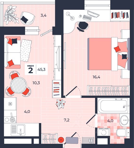 Продаётся 2-комнатная квартира в строящемся доме (Дом 30), срок сдачи: IV-кв. 2026, общей площадью 45.3 кв.м., на 13 этаже. Расположение, транспортная доступность Новый жилой комплекс "Юго-Восточный" строится в Туле, в 3,5 км от центра города. Благодаря удачным транспортным развязкам, автолюбители смогут доехать до центральных кварталов примерно за 5 10 минут, составив наиболее быстрый и удобный маршрут с учетом загруженности дорог. Проблем с мобильностью не возникнет и у пассажиров общественного транспорта. Рядом с домом расположены остановки автобусов и маршрутных такси, которые быстро довезут до любого района города. Так, чтобы добраться до центра, следует дойти пешком до остановки "Медтехника", где останавливается маршрутное такси, доезжающее до центральных кварталов всего за 7 8 минут. Инфраструктура Район, где возводится новый жилой комплекс, активно застраивается, и сеть инфраструктуры сов временем будет расширяться. Но и сейчас все, что нужно для комфортной жизни в городе, находится недалеко от жилого комплекса. В шаговой доступности расположены продуктовые магазины: "Виктория", "Овощи-фрукты", Магазин рыбы и мяса птицы, магазин мяса и колбас "У Максима", супермаркеты "Дикси", "Пятерочка", "SPAR". Неподалеку находится гипермаркет "Линия", крупный торговый центр, в котором расположены отделения банков, гипермаркет "Глобус", салон оптики, мебельный магазин "Столплит", зоомагазин "Четыре лапы" и пр. В соседнем здании находится строительный гипермаркет "Леруа Мерлен", за ним крупный магазин товаров для спорта, туризма и активного отдыха "Декатлон".Недалеко от жилого комплекса открыты кафе и рестораны: кофейня "Bonape", пиццерия "Культура", кафе "Вкуснов", кафе быстрого обслуживания "Rapido", ресторан "У фонтана" и пр.В районе есть аптеки, поликлиники, диагностические центры. В шаговой доступности от жилого комплекса расположено несколько детских садиков, в том числе, садик комбинированного вида "Алые паруса". Есть дошкольные отделения, входящие в состав образовательных центров, Центры развития ребенка. Поблизости расположены средние школы, в том числе, школа для детей с ОВЗ. Рядом с жилым комплексом находится Тульская Духовная Семинария и Суворовское училище. Надежность застройщик: достраивает объект ООО Ин-Групп.АрхитектураЖилой комплекс будет представлен 19 монолитно-кирпичными корпусами переменной этажности, выполненными в едином архитектурном стиле. При строительстве ЖК "Юго-Восточный" применяются современные материалы высокого качества, которые обеспечивают надежность домов и комфортный микроклимат в помещениях. Каждая секция оснащается современными лифтами. Помещения общего пользования отделываются экологичными материалами. Квартиры предлагаются однокомнатные (от 43,9 кв. м), двухкомнатные (от 45,8 кв. м), трехкомнатные (от 60,4 кв. м) и четырехкомнатные (от 87,2 кв. м), а также уютные студии (от 28,9 кв. м).На внутренней территории проводится комплексное благоустройство: озеленение, организация игровых площадок, мест для отдыха и за