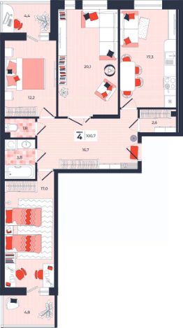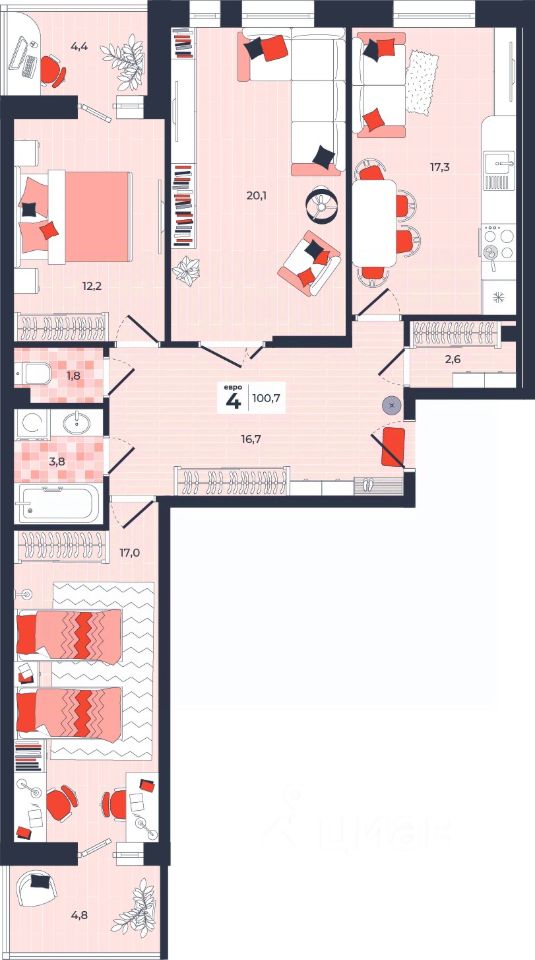Продаётся 4-комнатная квартира в строящемся доме (Дом 30), срок сдачи: IV-кв. 2026, общей площадью 100.7 кв.м., на 2 этаже. Расположение, транспортная доступность Новый жилой комплекс "Юго-Восточный" строится в Туле, в 3,5 км от центра города. Благодаря удачным транспортным развязкам, автолюбители смогут доехать до центральных кварталов примерно за 5 10 минут, составив наиболее быстрый и удобный маршрут с учетом загруженности дорог. Проблем с мобильностью не возникнет и у пассажиров общественного транспорта. Рядом с домом расположены остановки автобусов и маршрутных такси, которые быстро довезут до любого района города. Так, чтобы добраться до центра, следует дойти пешком до остановки "Медтехника", где останавливается маршрутное такси, доезжающее до центральных кварталов всего за 7 8 минут. Инфраструктура Район, где возводится новый жилой комплекс, активно застраивается, и сеть инфраструктуры сов временем будет расширяться. Но и сейчас все, что нужно для комфортной жизни в городе, находится недалеко от жилого комплекса. В шаговой доступности расположены продуктовые магазины: "Виктория", "Овощи-фрукты", Магазин рыбы и мяса птицы, магазин мяса и колбас "У Максима", супермаркеты "Дикси", "Пятерочка", "SPAR". Неподалеку находится гипермаркет "Линия", крупный торговый центр, в котором расположены отделения банков, гипермаркет "Глобус", салон оптики, мебельный магазин "Столплит", зоомагазин "Четыре лапы" и пр. В соседнем здании находится строительный гипермаркет "Леруа Мерлен", за ним крупный магазин товаров для спорта, туризма и активного отдыха "Декатлон".Недалеко от жилого комплекса открыты кафе и рестораны: кофейня "Bonape", пиццерия "Культура", кафе "Вкуснов", кафе быстрого обслуживания "Rapido", ресторан "У фонтана" и пр.В районе есть аптеки, поликлиники, диагностические центры. В шаговой доступности от жилого комплекса расположено несколько детских садиков, в том числе, садик комбинированного вида "Алые паруса". Есть дошкольные отделения, входящие в состав образовательных центров, Центры развития ребенка. Поблизости расположены средние школы, в том числе, школа для детей с ОВЗ. Рядом с жилым комплексом находится Тульская Духовная Семинария и Суворовское училище. Надежность застройщик: достраивает объект ООО Ин-Групп.АрхитектураЖилой комплекс будет представлен 19 монолитно-кирпичными корпусами переменной этажности, выполненными в едином архитектурном стиле. При строительстве ЖК "Юго-Восточный" применяются современные материалы высокого качества, которые обеспечивают надежность домов и комфортный микроклимат в помещениях. Каждая секция оснащается современными лифтами. Помещения общего пользования отделываются экологичными материалами. Квартиры предлагаются однокомнатные (от 43,9 кв. м), двухкомнатные (от 45,8 кв. м), трехкомнатные (от 60,4 кв. м) и четырехкомнатные (от 87,2 кв. м), а также уютные студии (от 28,9 кв. м).На внутренней территории проводится комплексное благоустройство: озеленение, организация игровых площадок, мест для отдыха и за